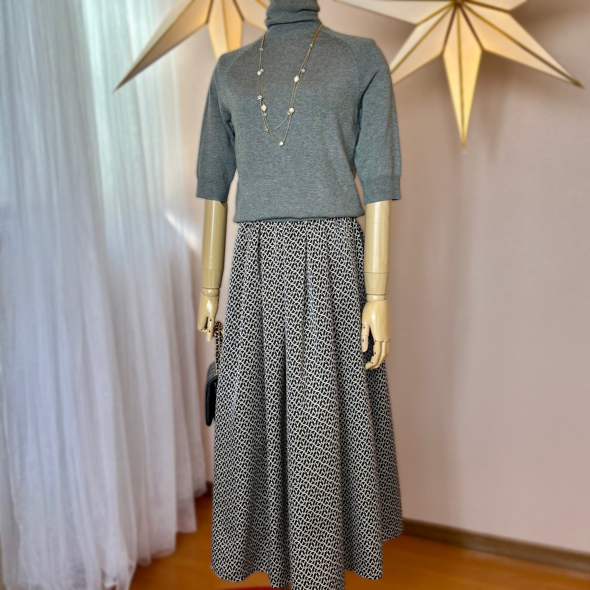 コーディネートしやすい柄で、シンプルなニットと合わせるだけで大人っぽいほどよい高級感のある装いになりました。