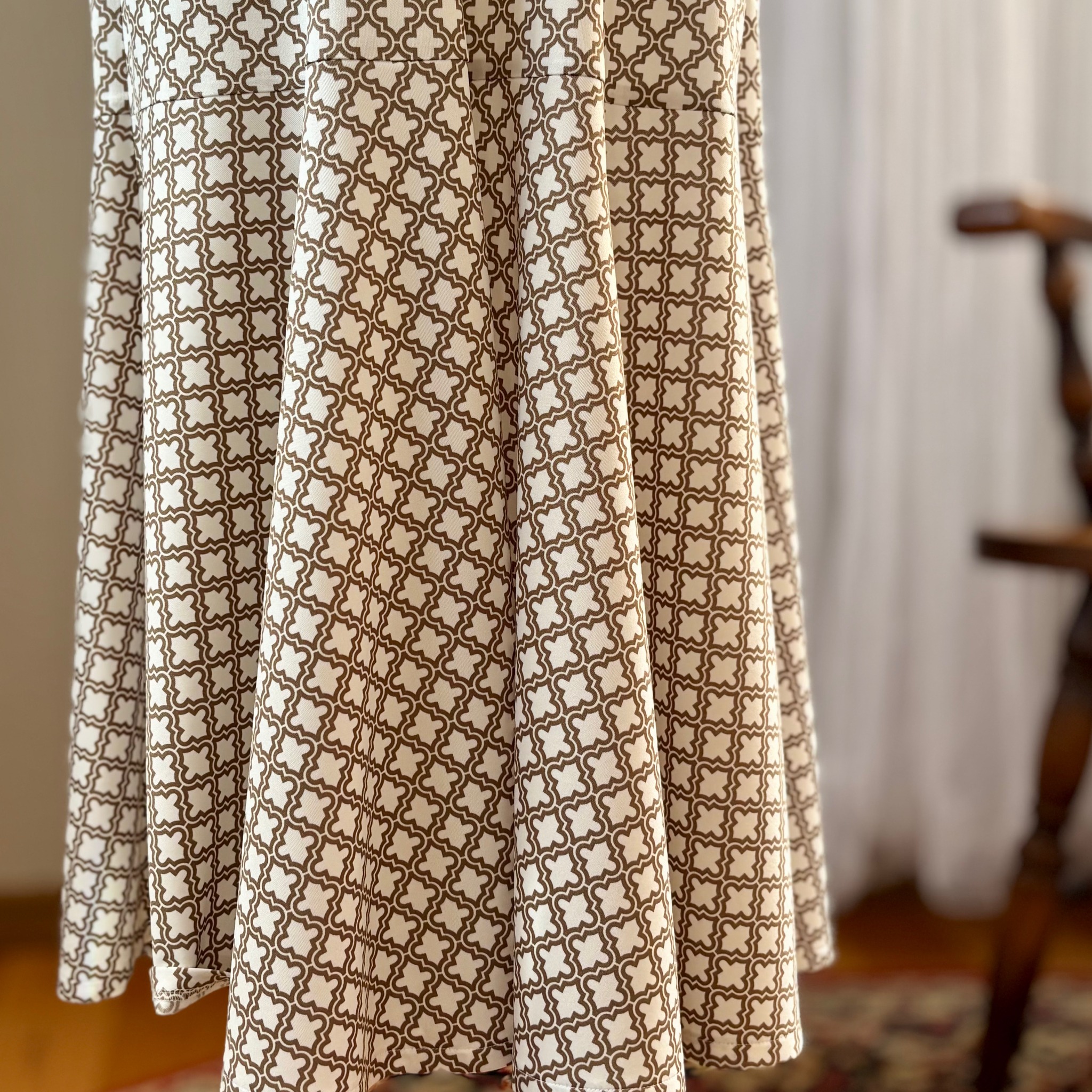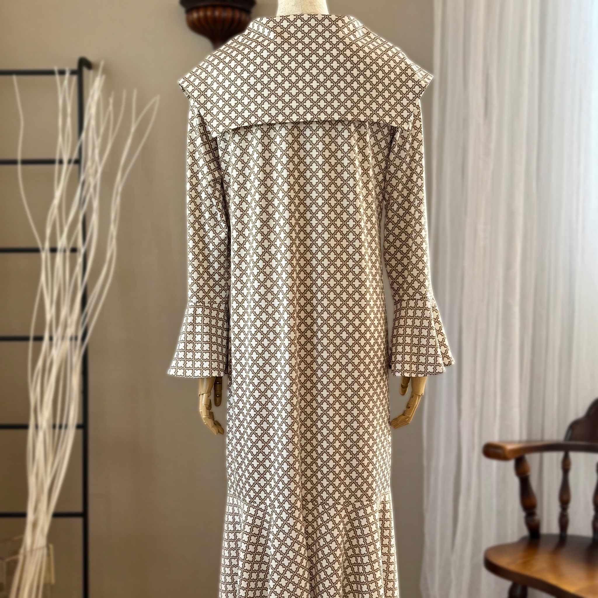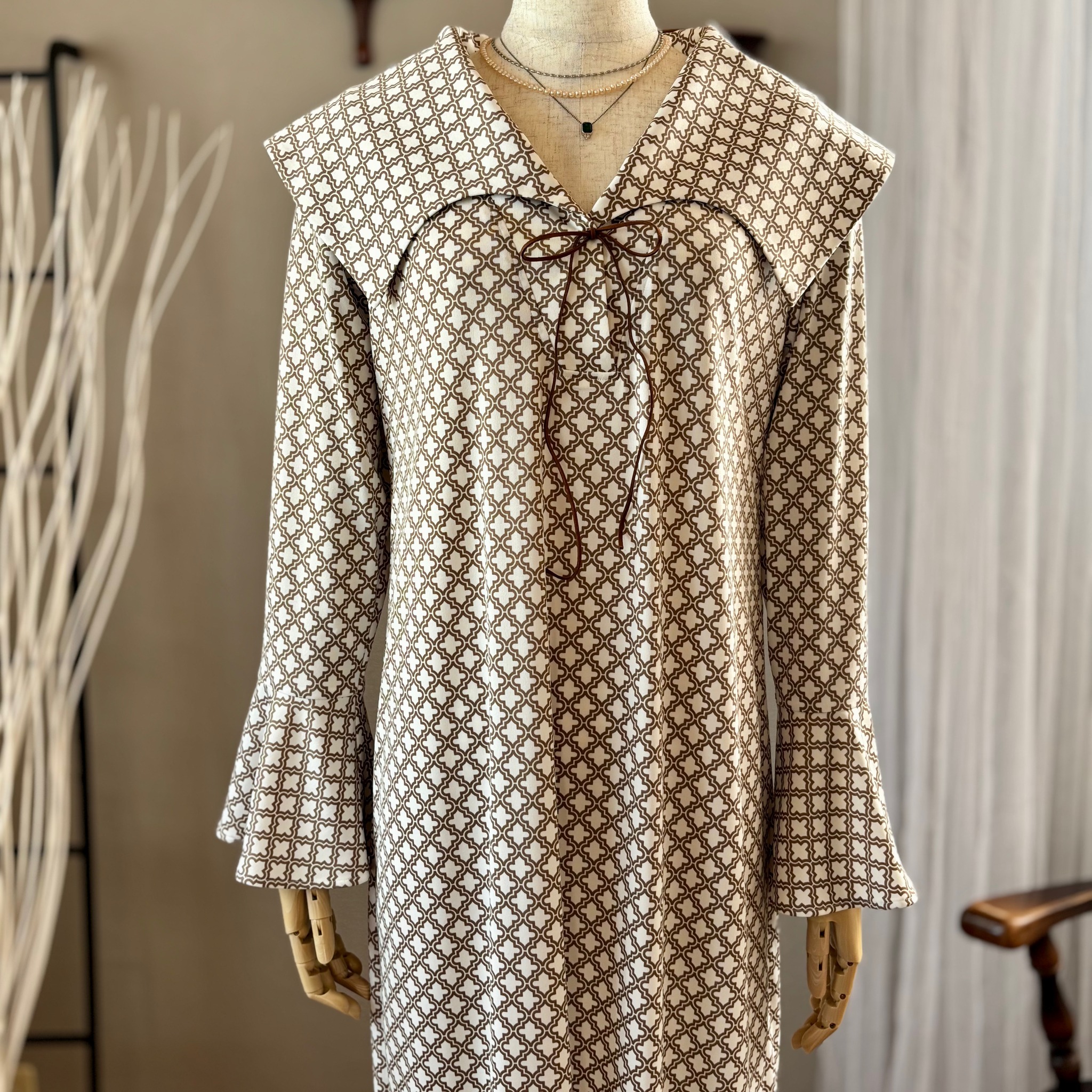 今回は当ショップで販売中の「スムースニット【モロッカン柄】」を使ってワンピースを作ってみました。生地選びの参考にしていただけたら嬉しいです。