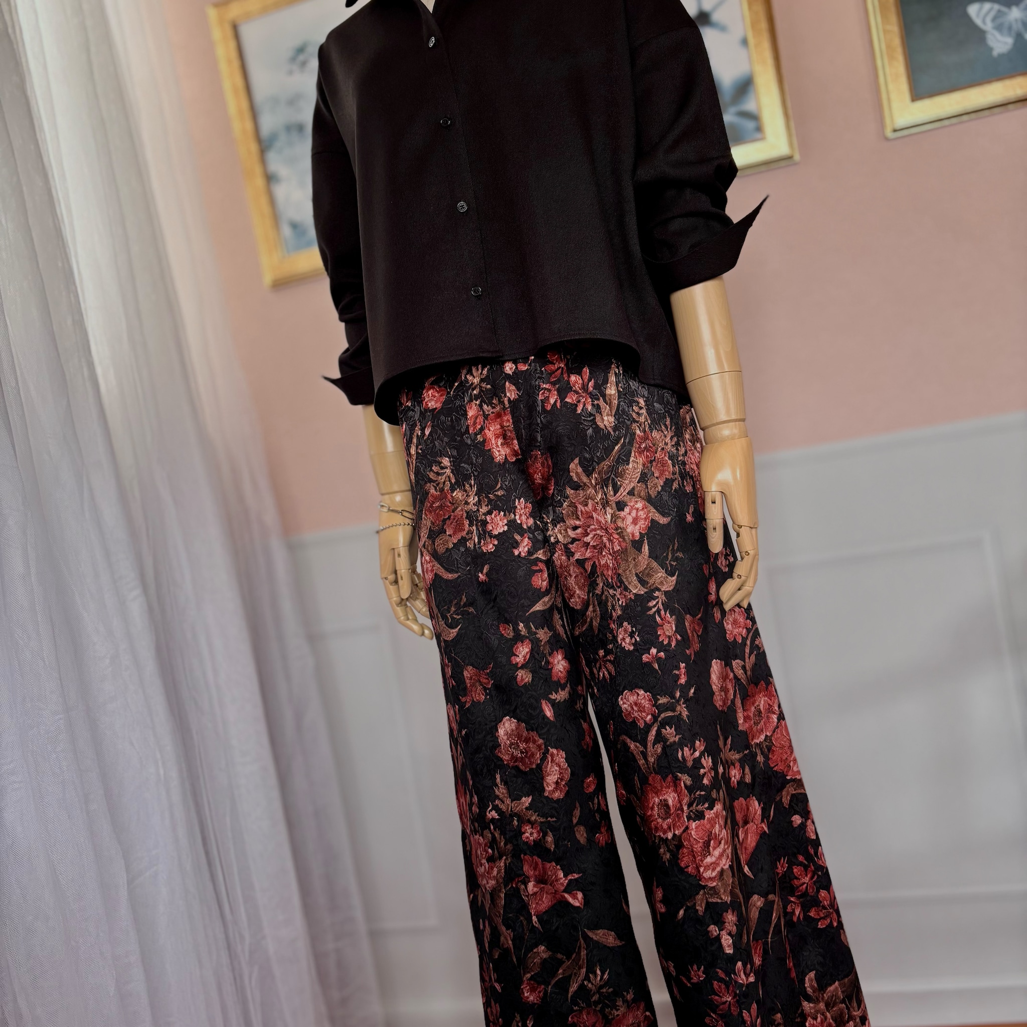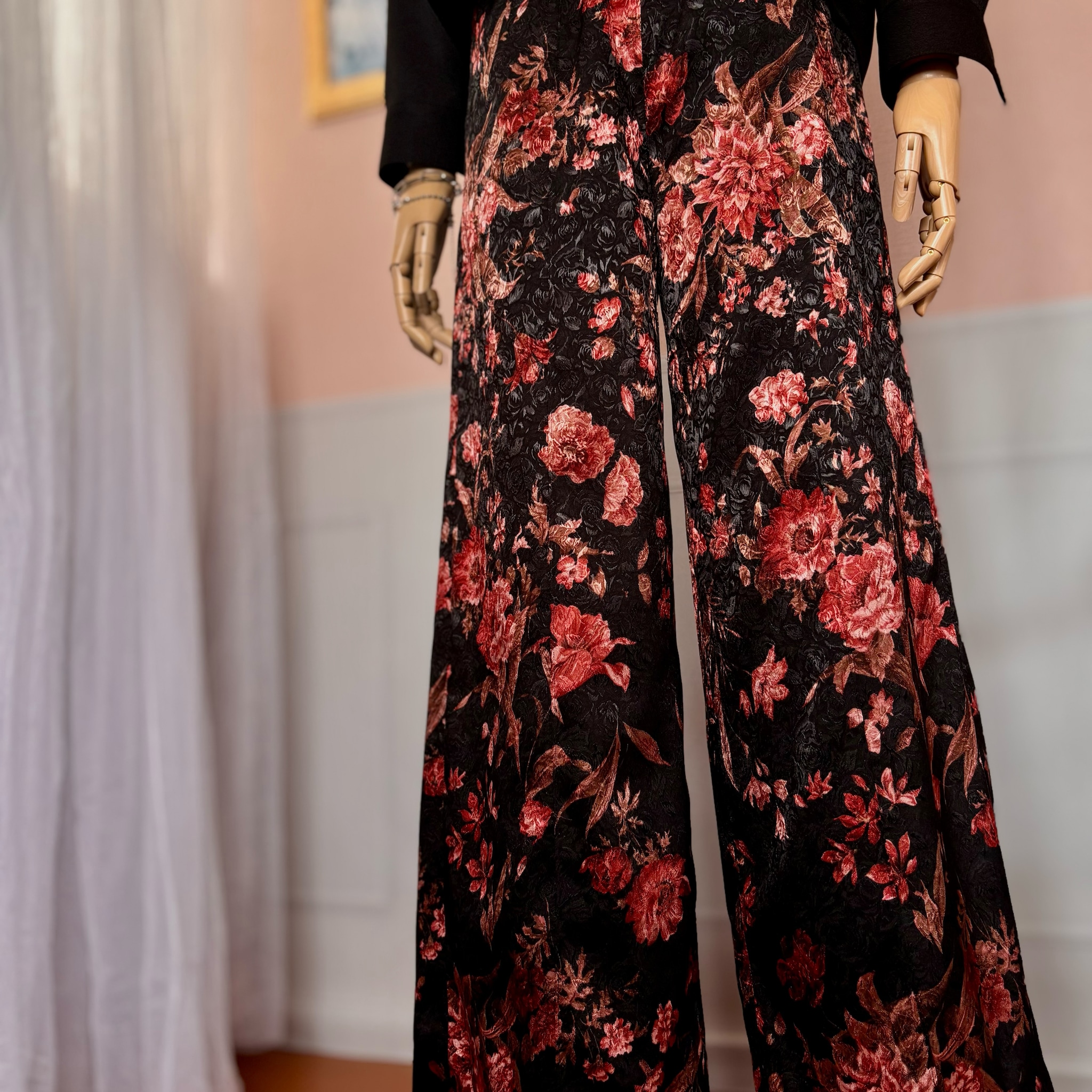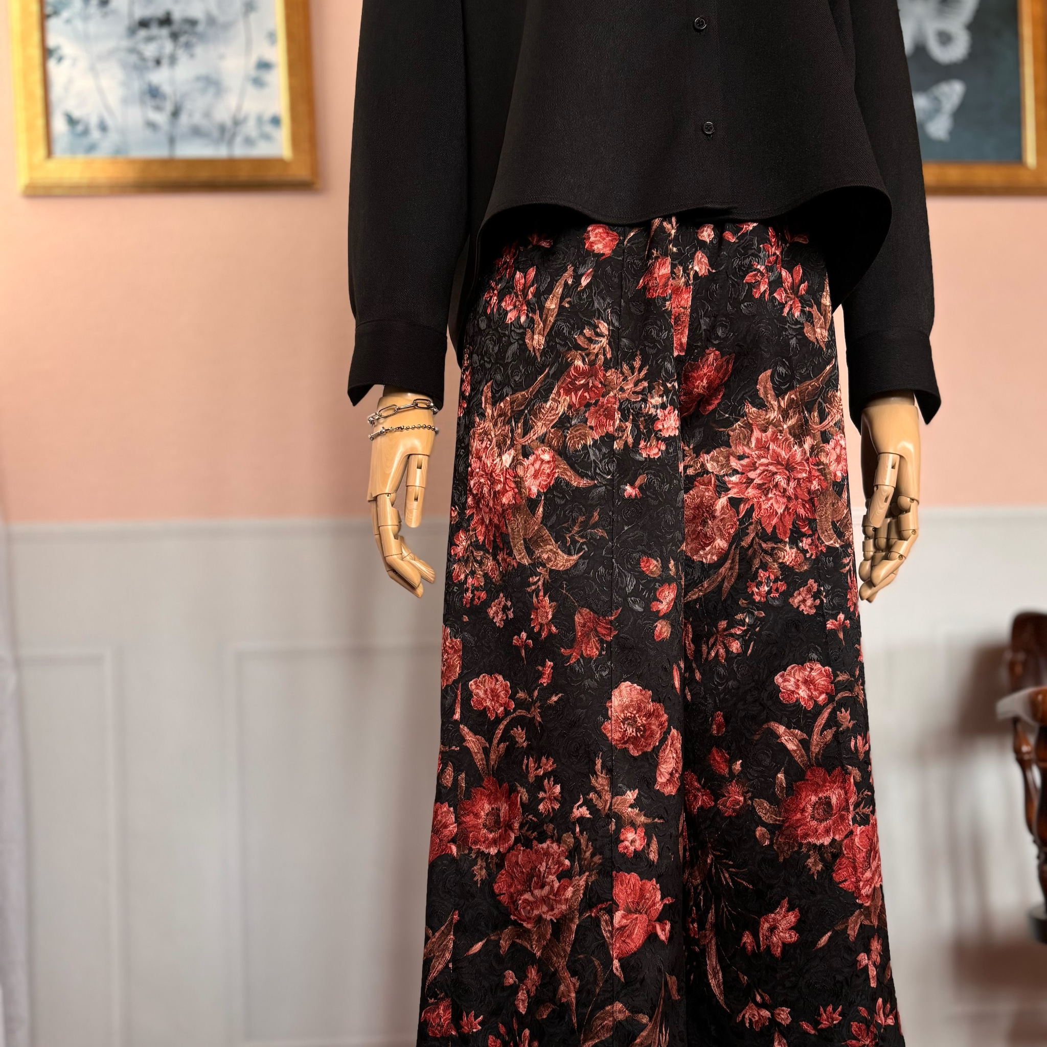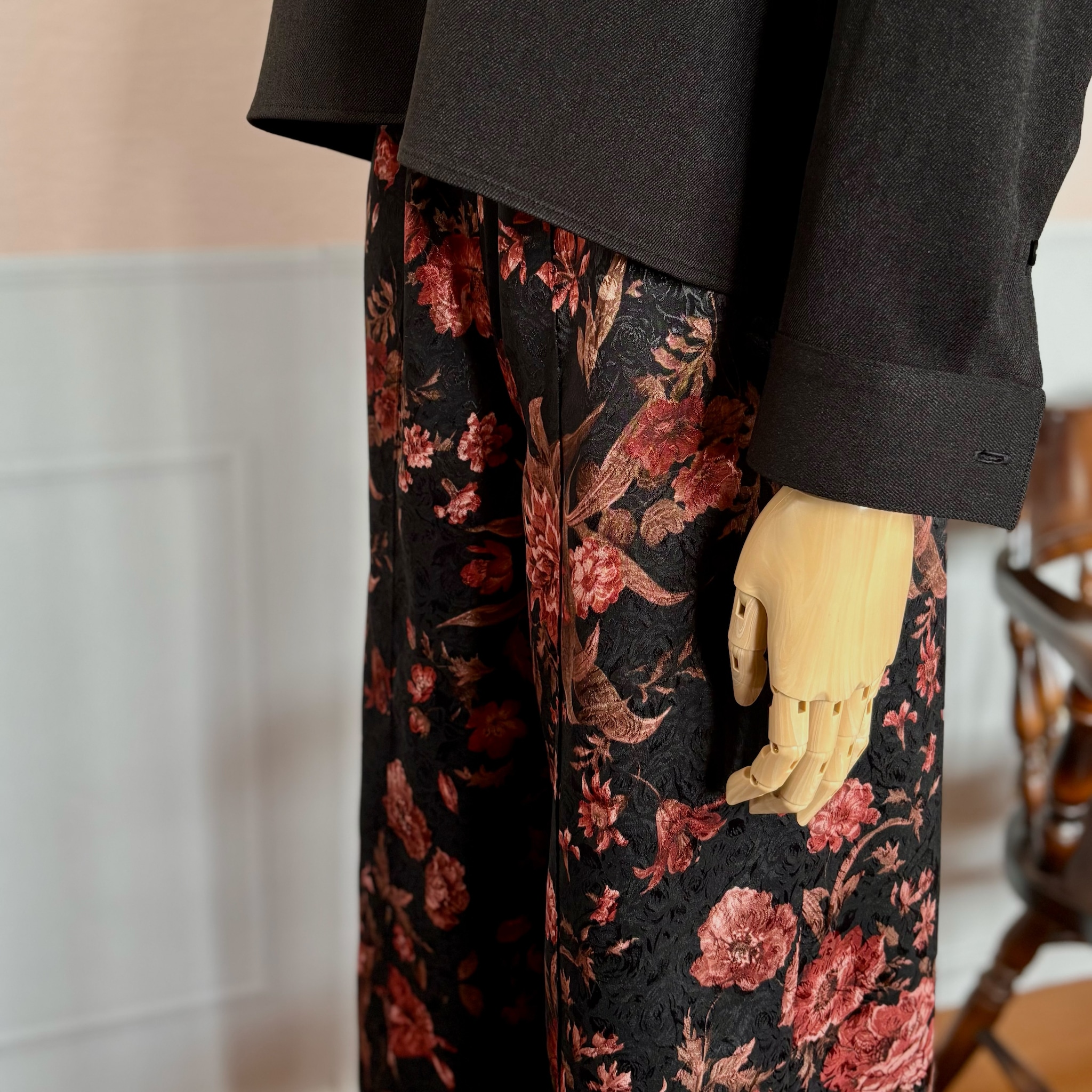 柄は大小さまざまな花模様が重なり、さらに地のブラック部分にも細かな織り柄が施されています。