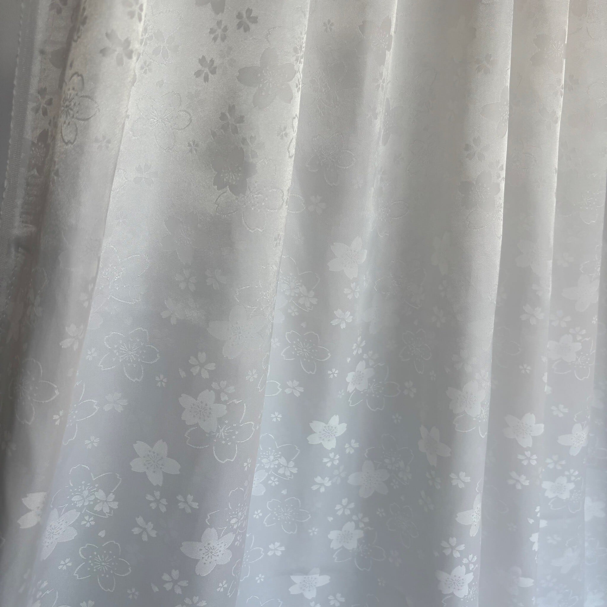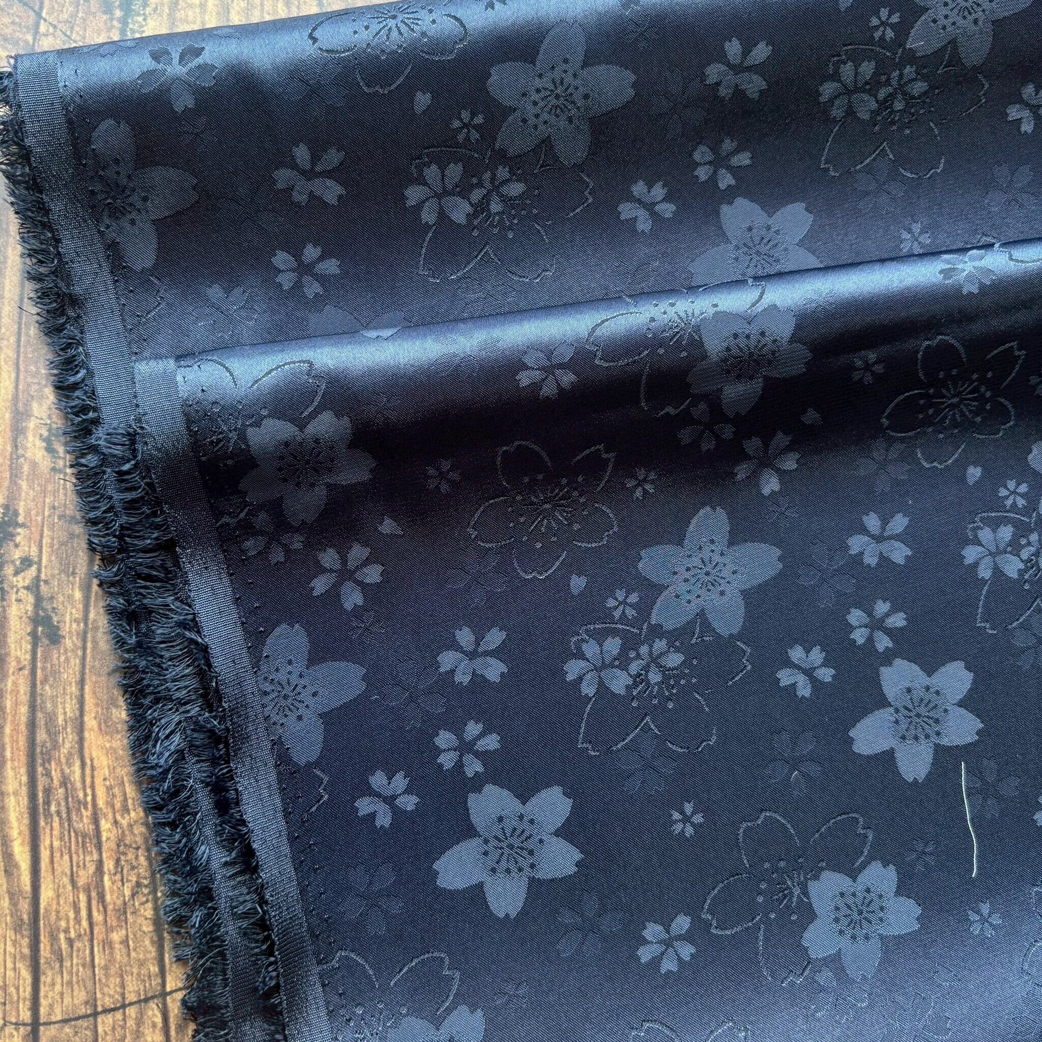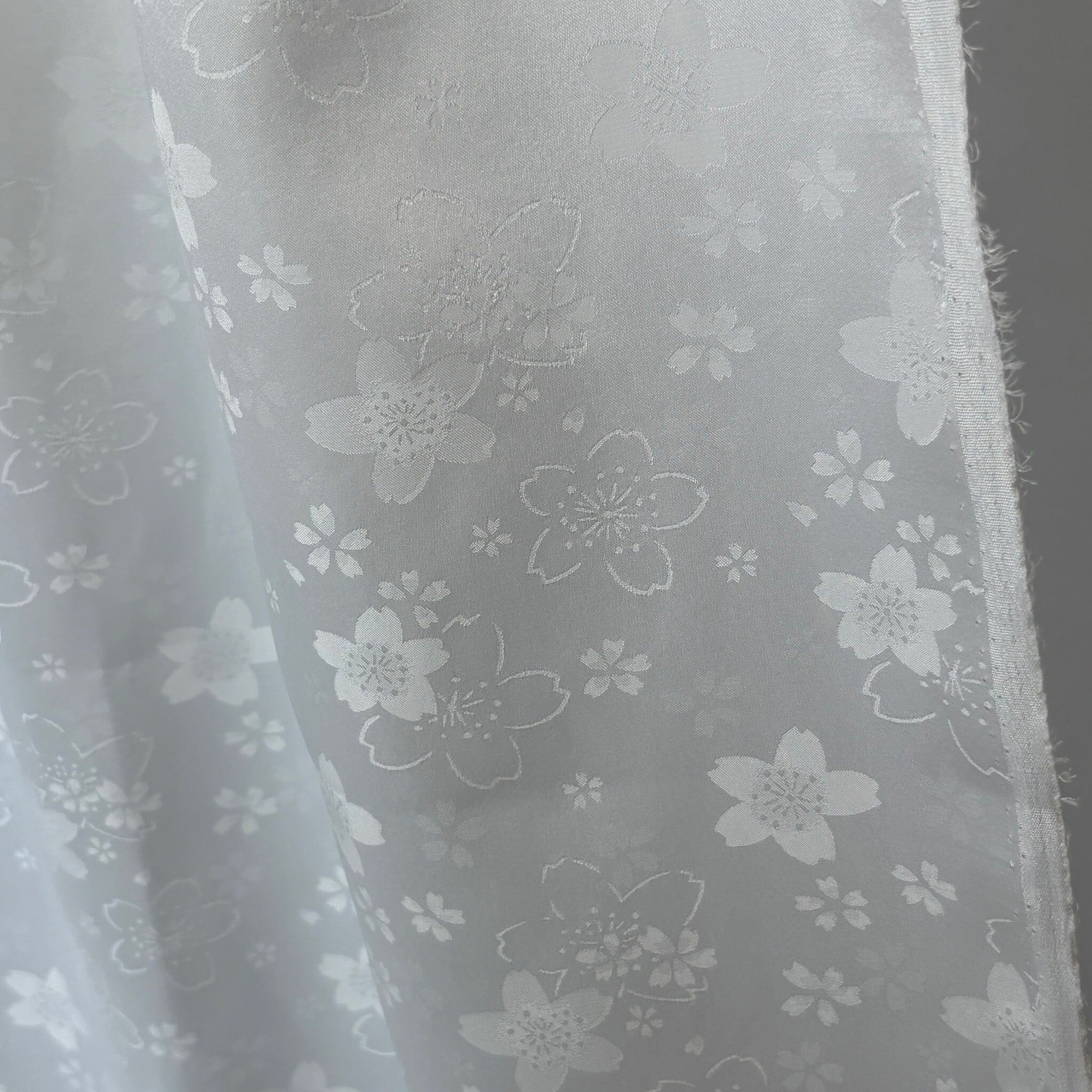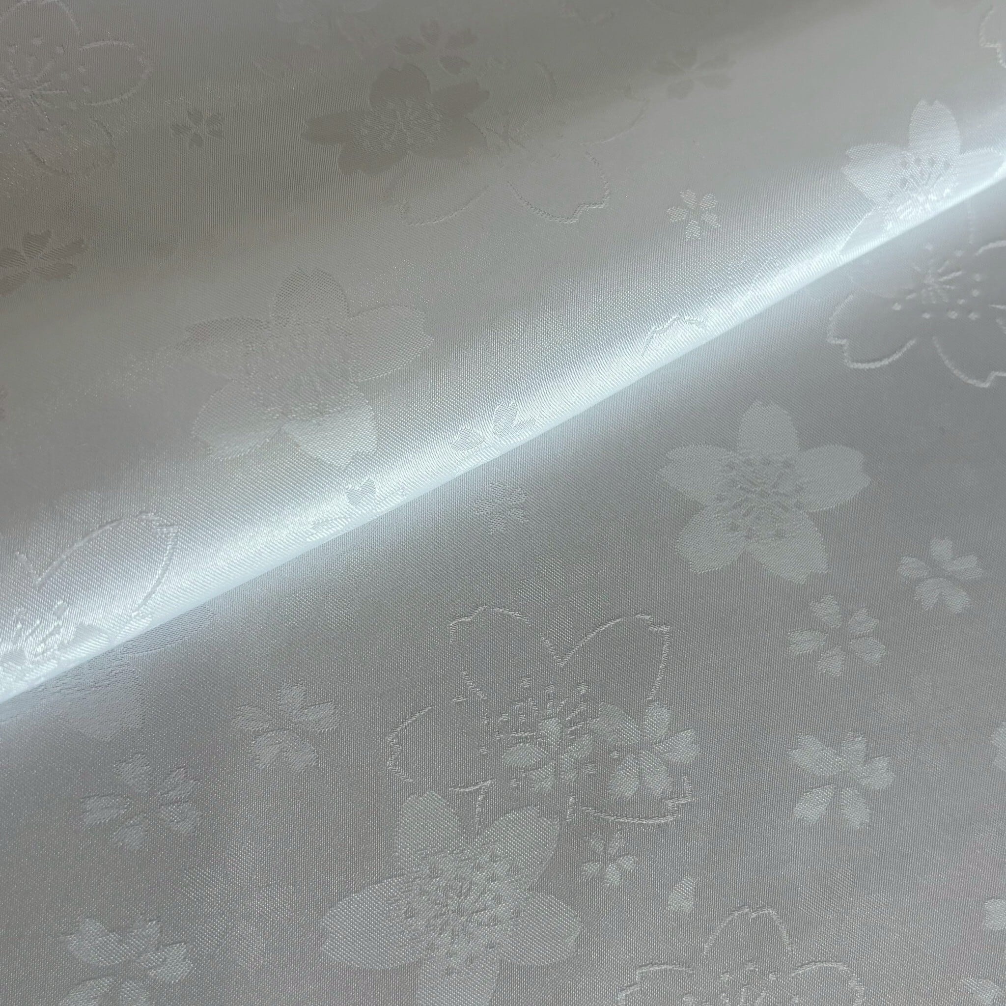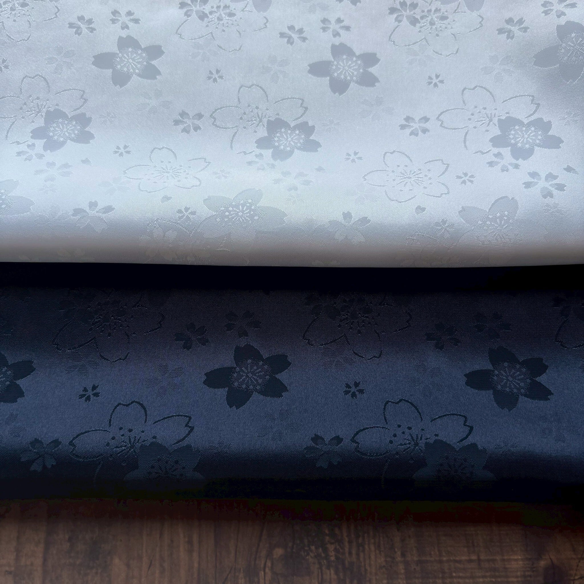 上品な光沢感のあるサテン地に、可愛らしい桜柄をジャガード織で表現した生地です。しっとりとしたなめらかな手触りと、ほどよいハリ感が魅力です。和洋どちらのスタイルにも合わせやすく、ブラウスやスカートはもちろん、スカーフやバッグの裏地、和装小物などにもおすすめです。