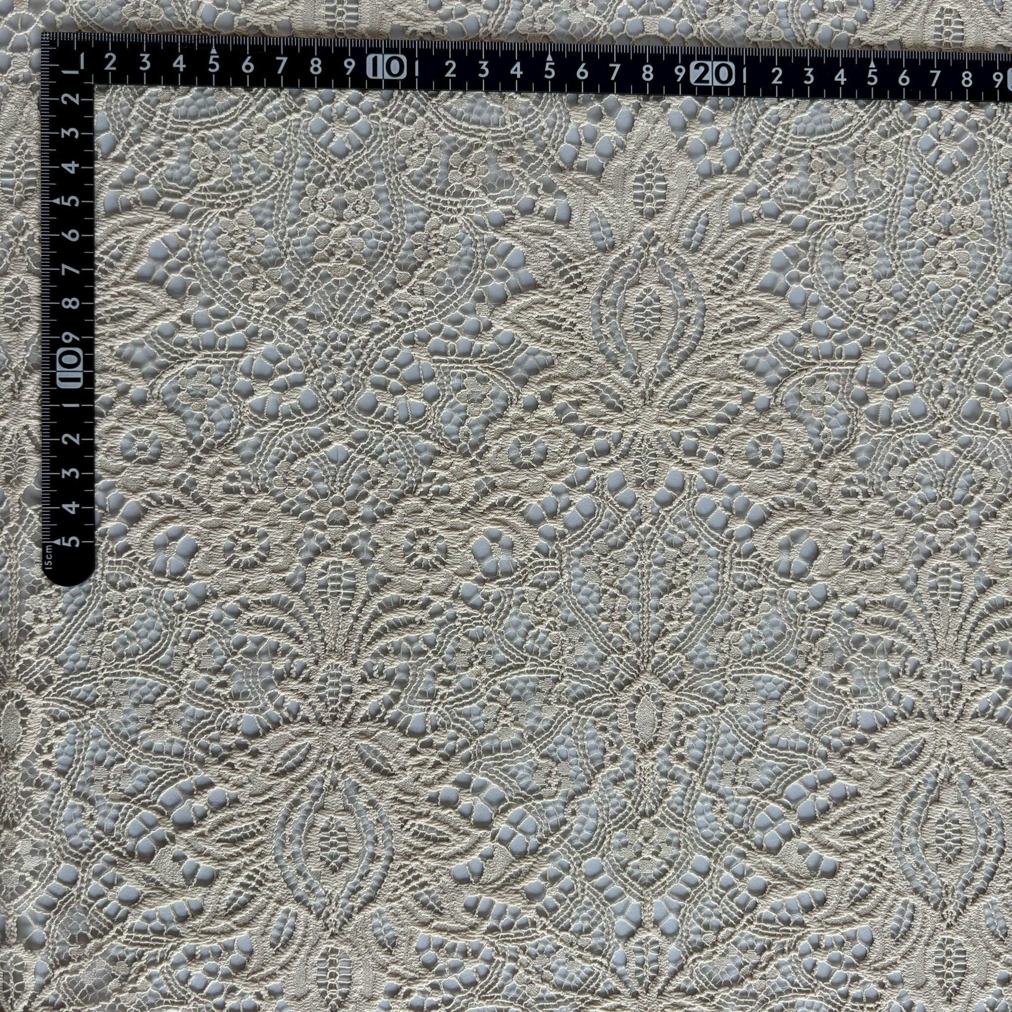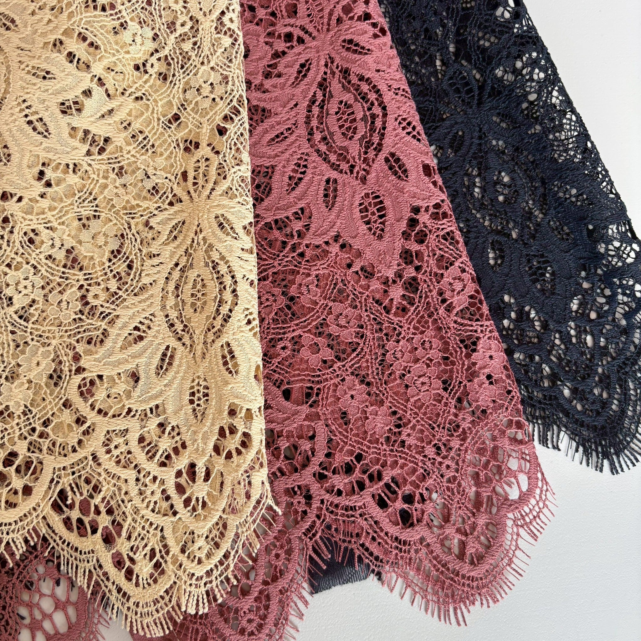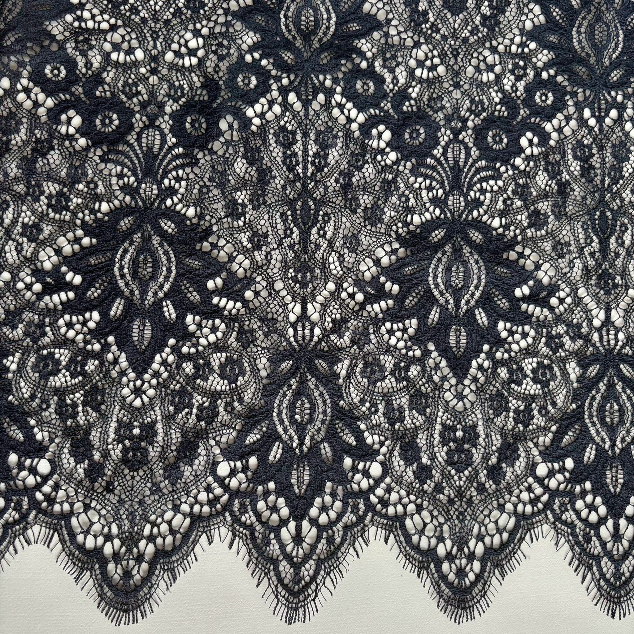 華やかで繊細な模様が美しい、高級レース地です。タイトスカートなどの洋服はもちろん、小物やインテリアなど、幅広い用途にご利用いただけます。生地の両端にはスカラップが施されており、そのままスカートの裾などにもご活用いただけます。