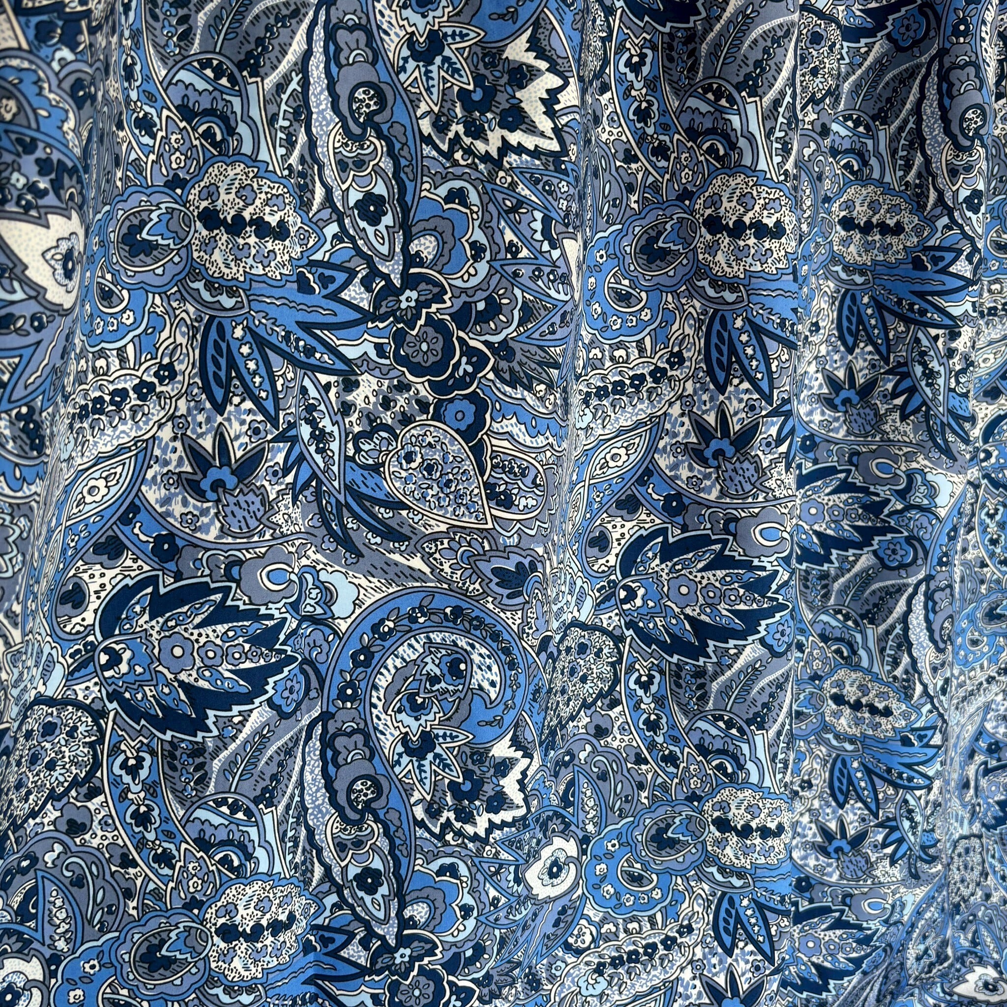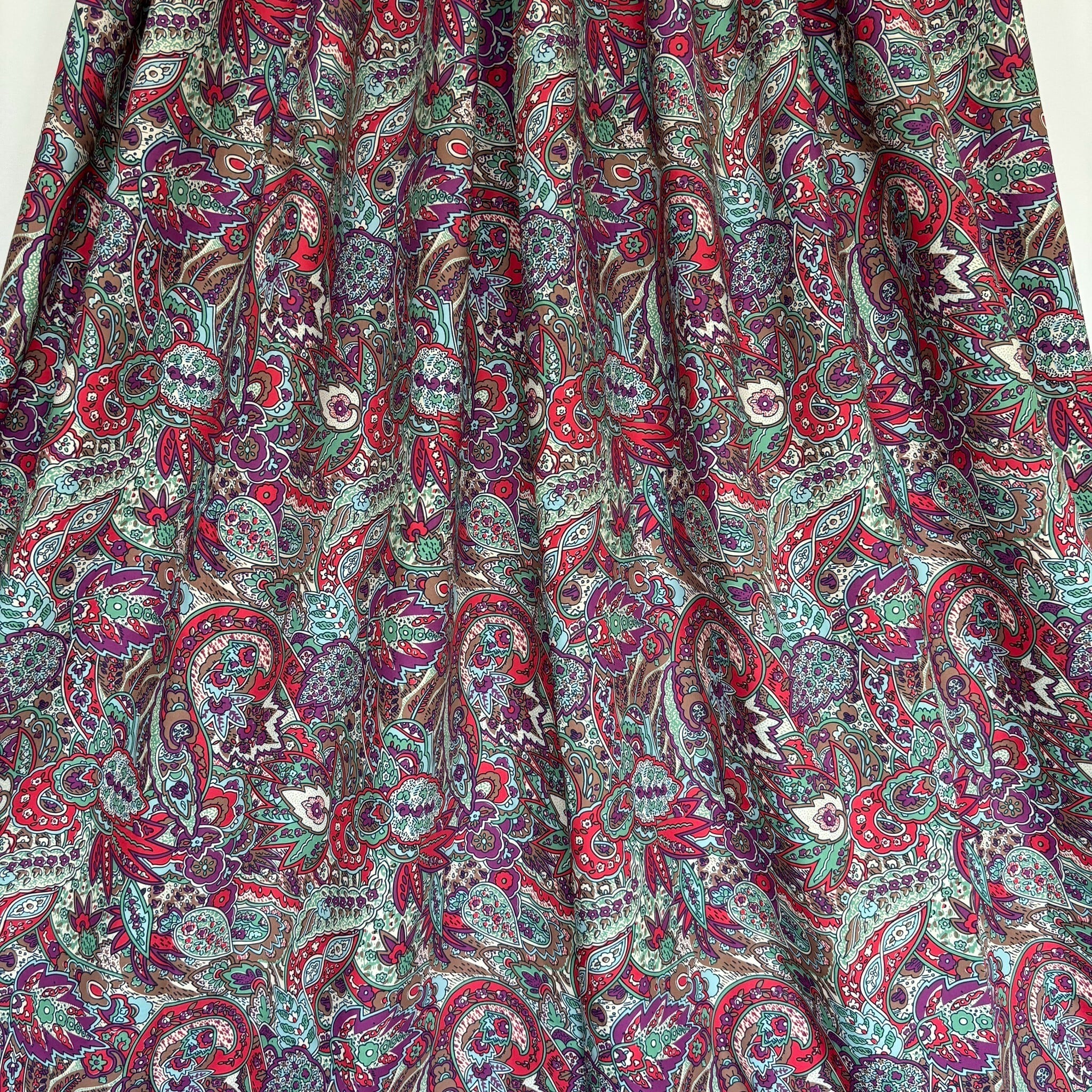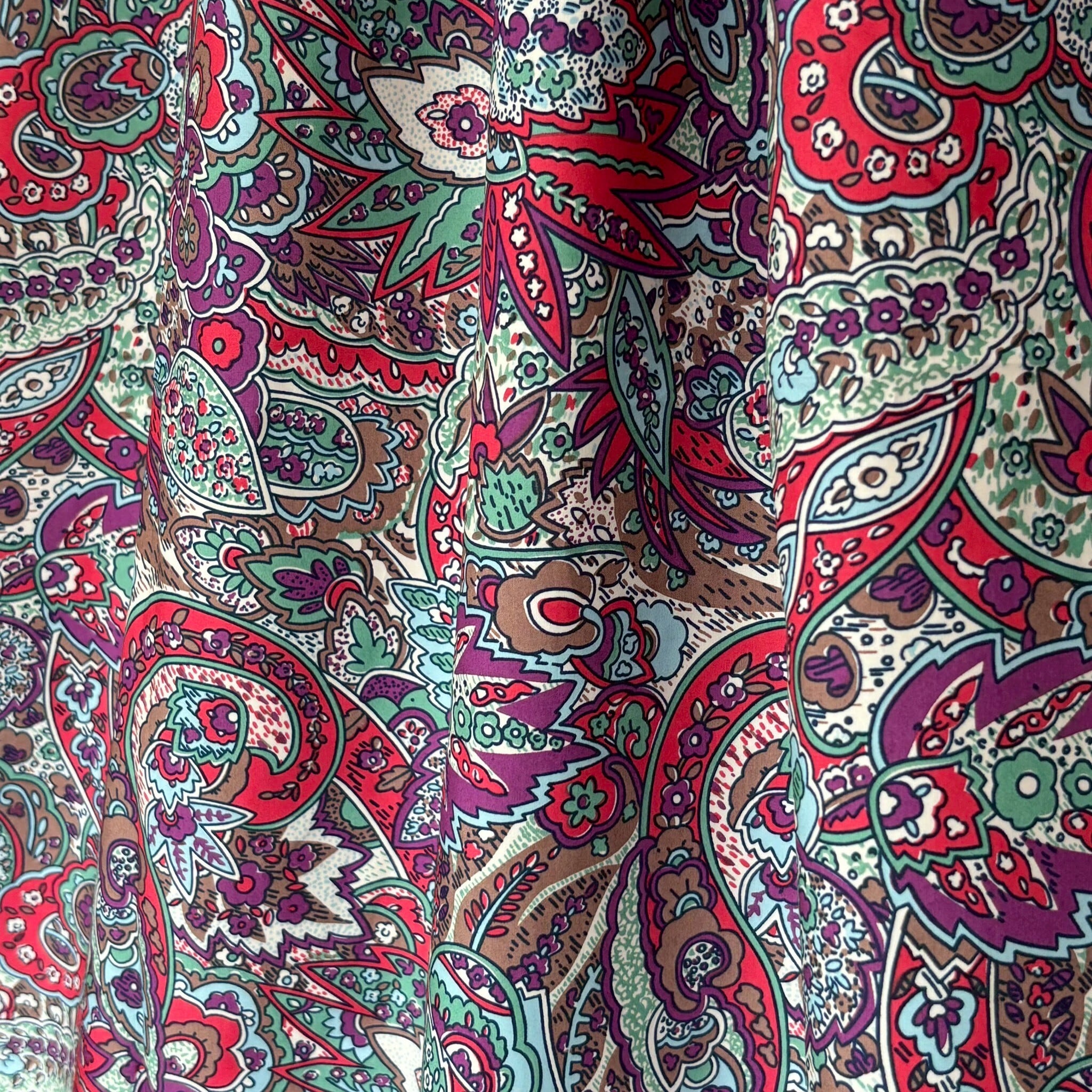 高密度な織りによるパリッとした質感が特徴のタイプライター生地です。薄手で軽く、ほどよいハリがあり、形をきれいにキープしてくれます。鮮やかなペイズリー柄が目を惹く、レトロで華やかなデザインです。