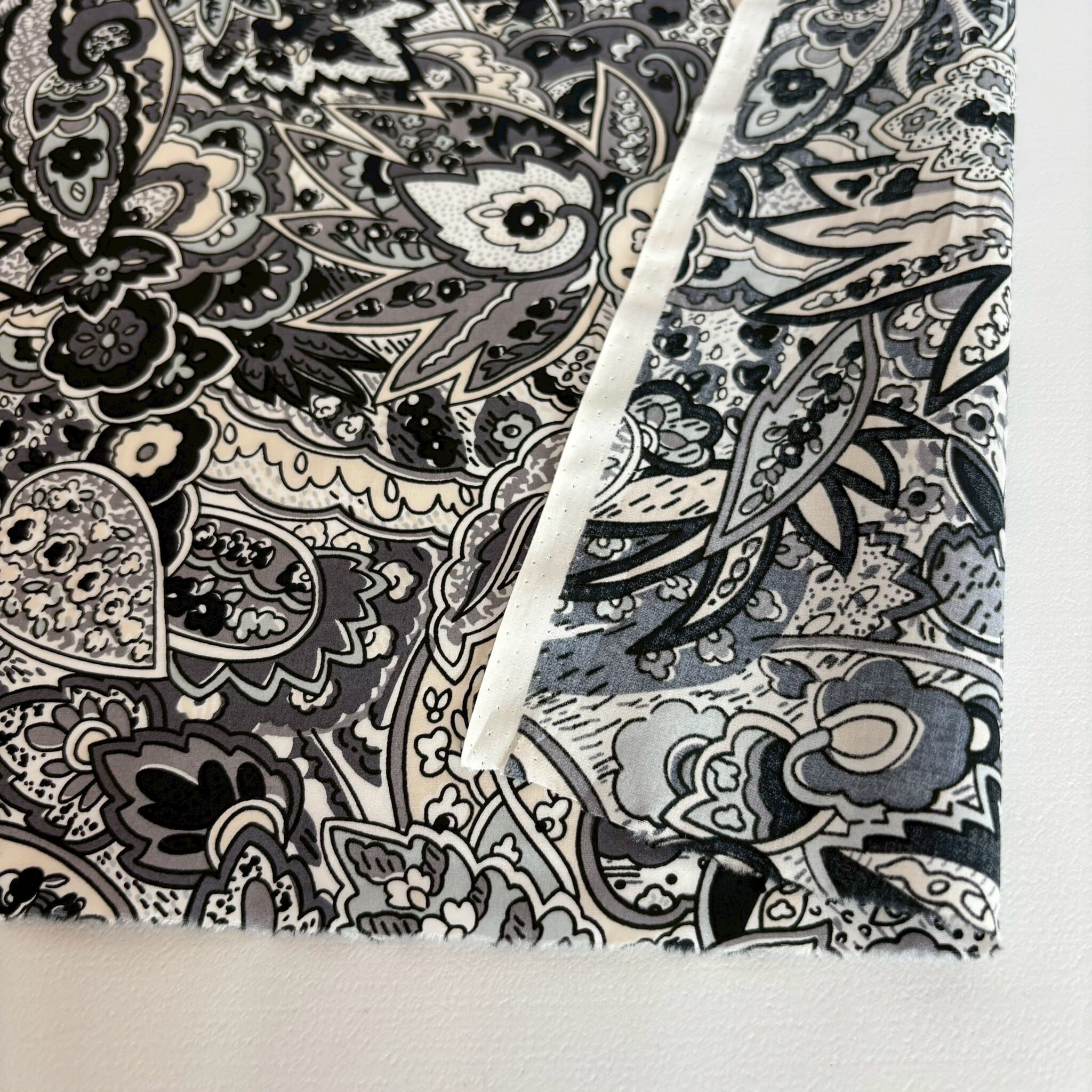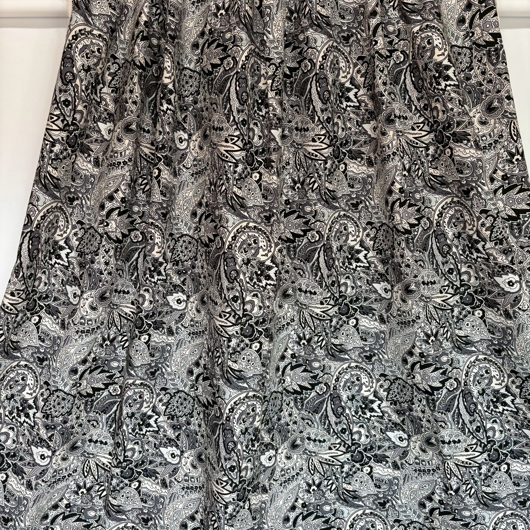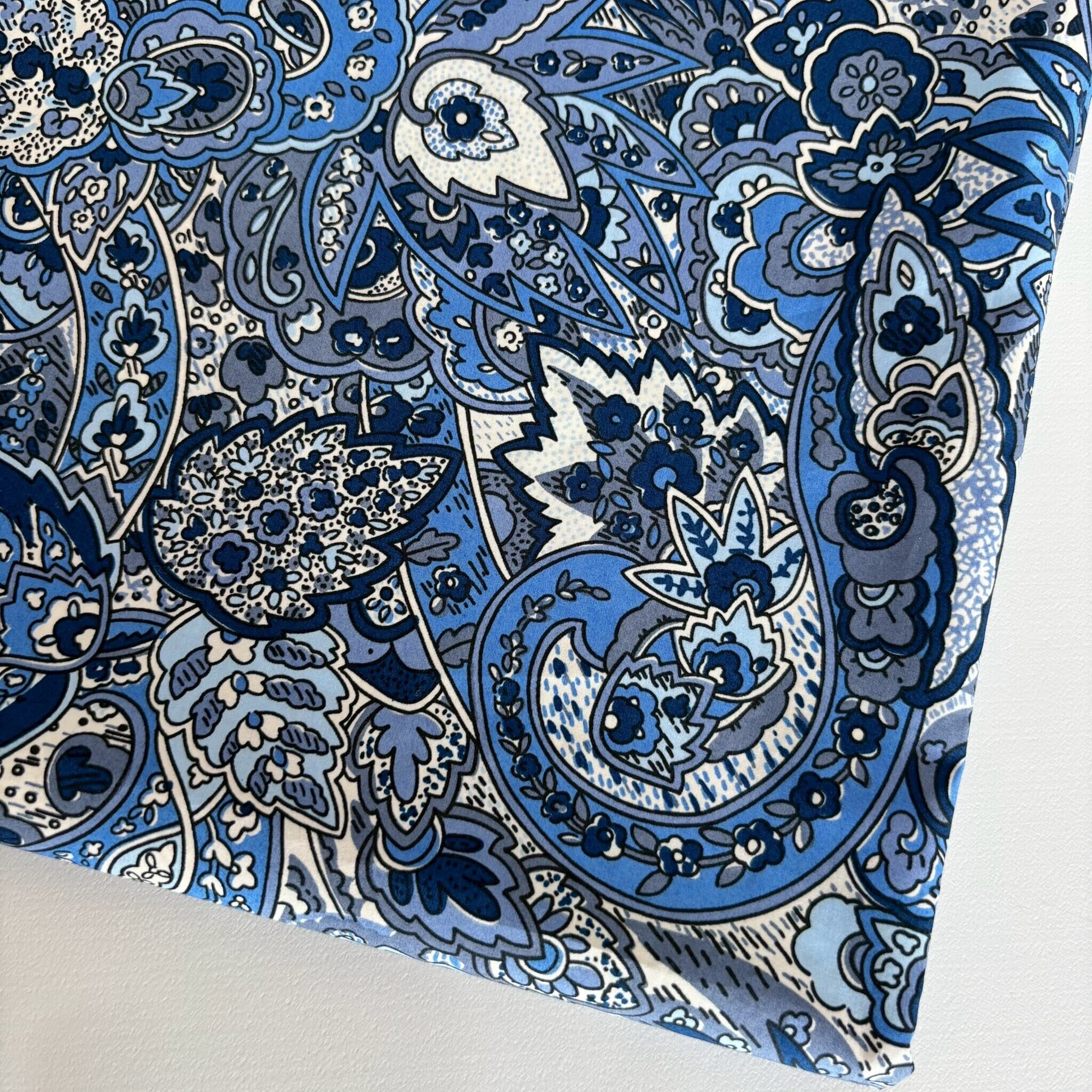 高密度な織りによるパリッとした質感が特徴のタイプライター生地です。薄手で軽く、ほどよいハリがあり、形をきれいにキープしてくれます。鮮やかなペイズリー柄が目を惹く、レトロで華やかなデザインです。