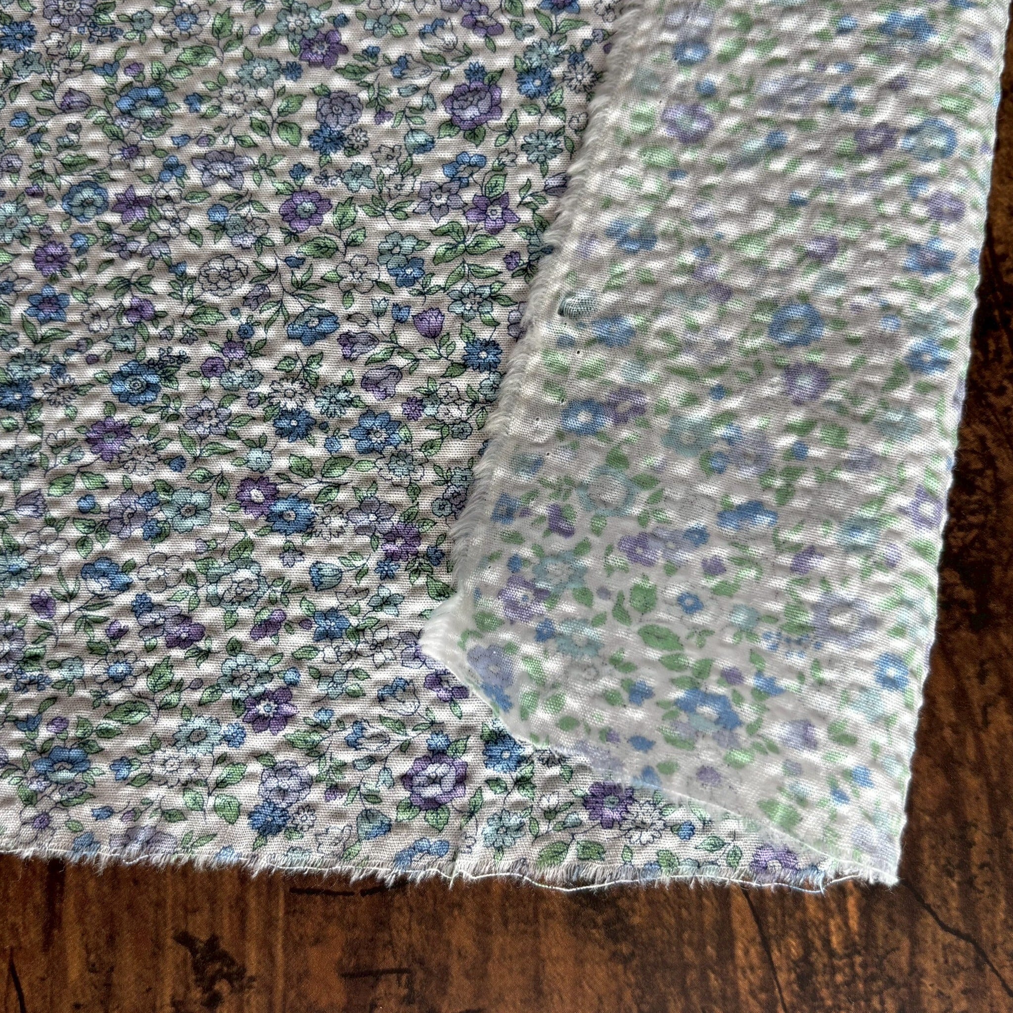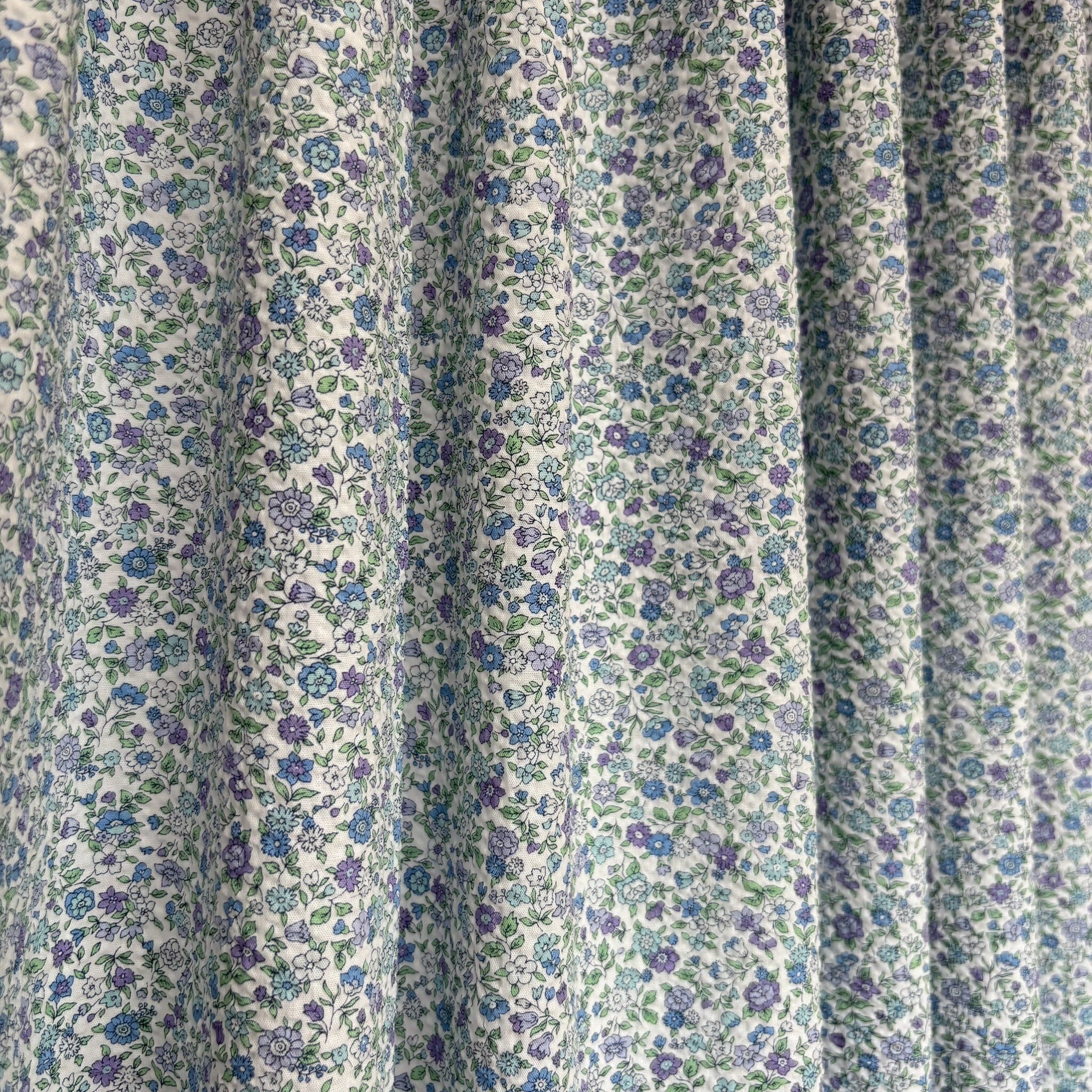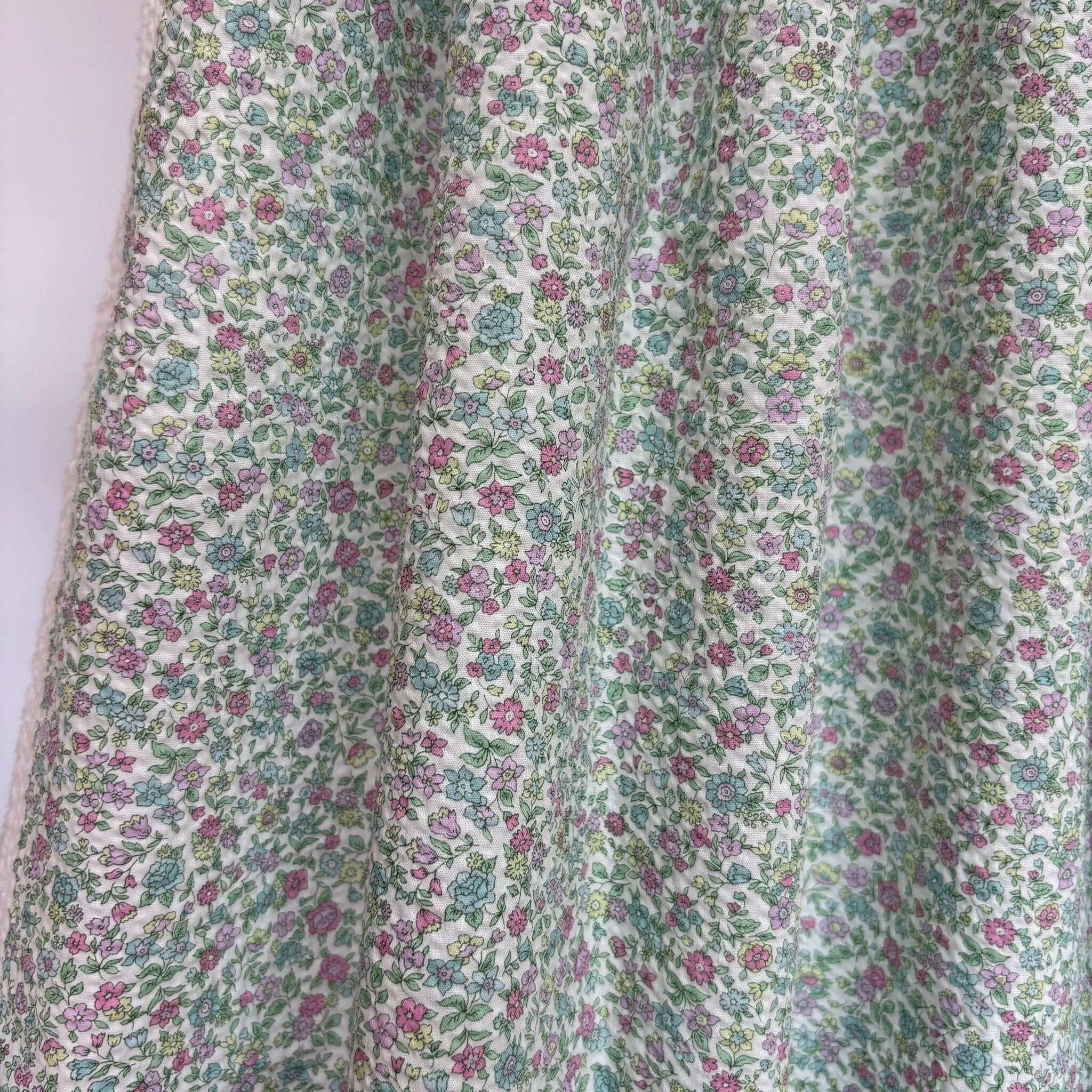 可愛らしい小花柄の、軽やかで肌ざわりの良いワッフル生地です。ワッフル特有の凹凸が通気性を高め、汗ばむ季節もさらっと快適に過ごせます。やわらかな風合いで着心地が良く、サマードレスや子供服、パジャマなど様々な用途にお使いいただけます。