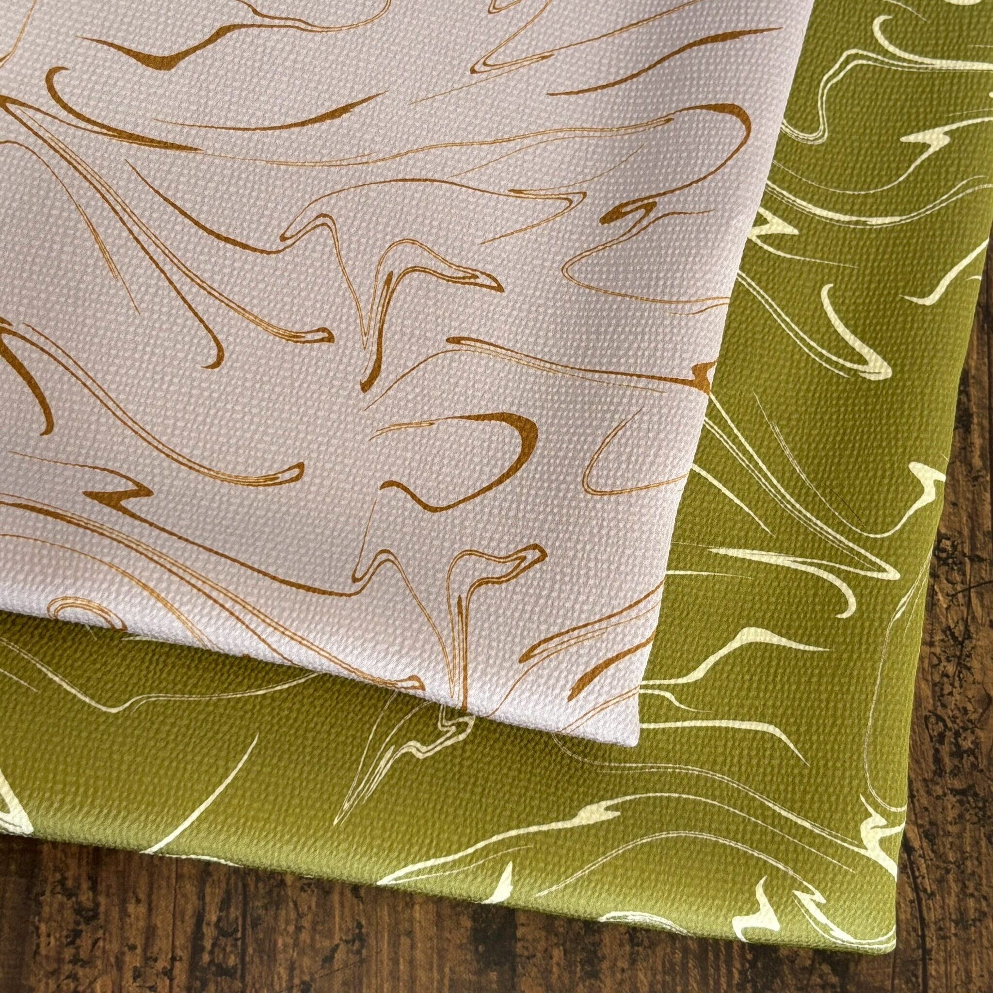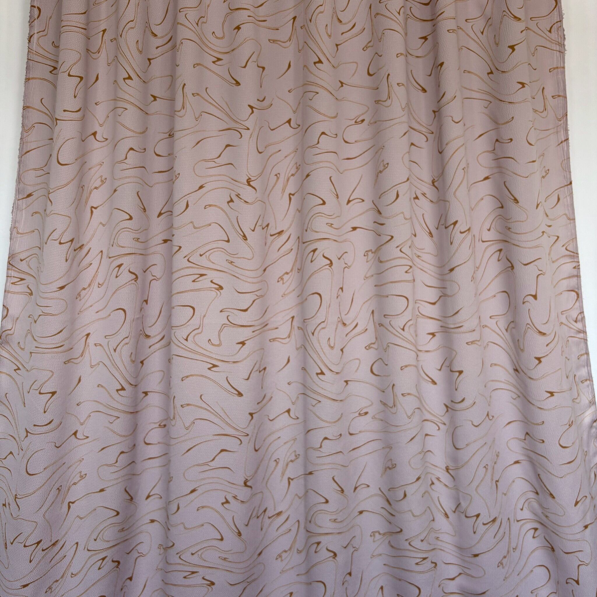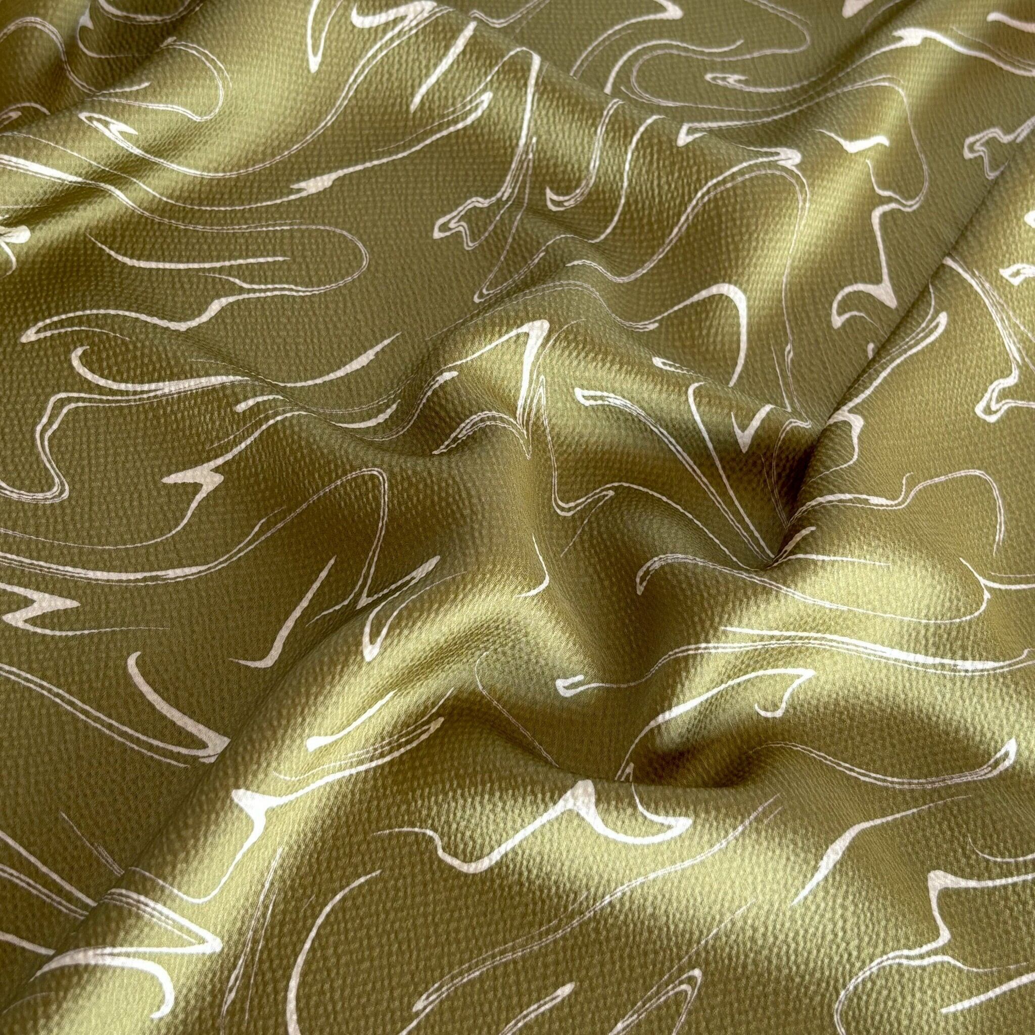 細かな凹凸のある繊細なシボが特徴で、見る角度によって光沢の表情が変わります。どこか和の趣を感じさせる柄行きで、落ち着きのある華やかさが魅力です。ストレッチ性に加え、接触冷感や速乾性も備えており、汗ばむ季節にも快適にお使いいただけます。