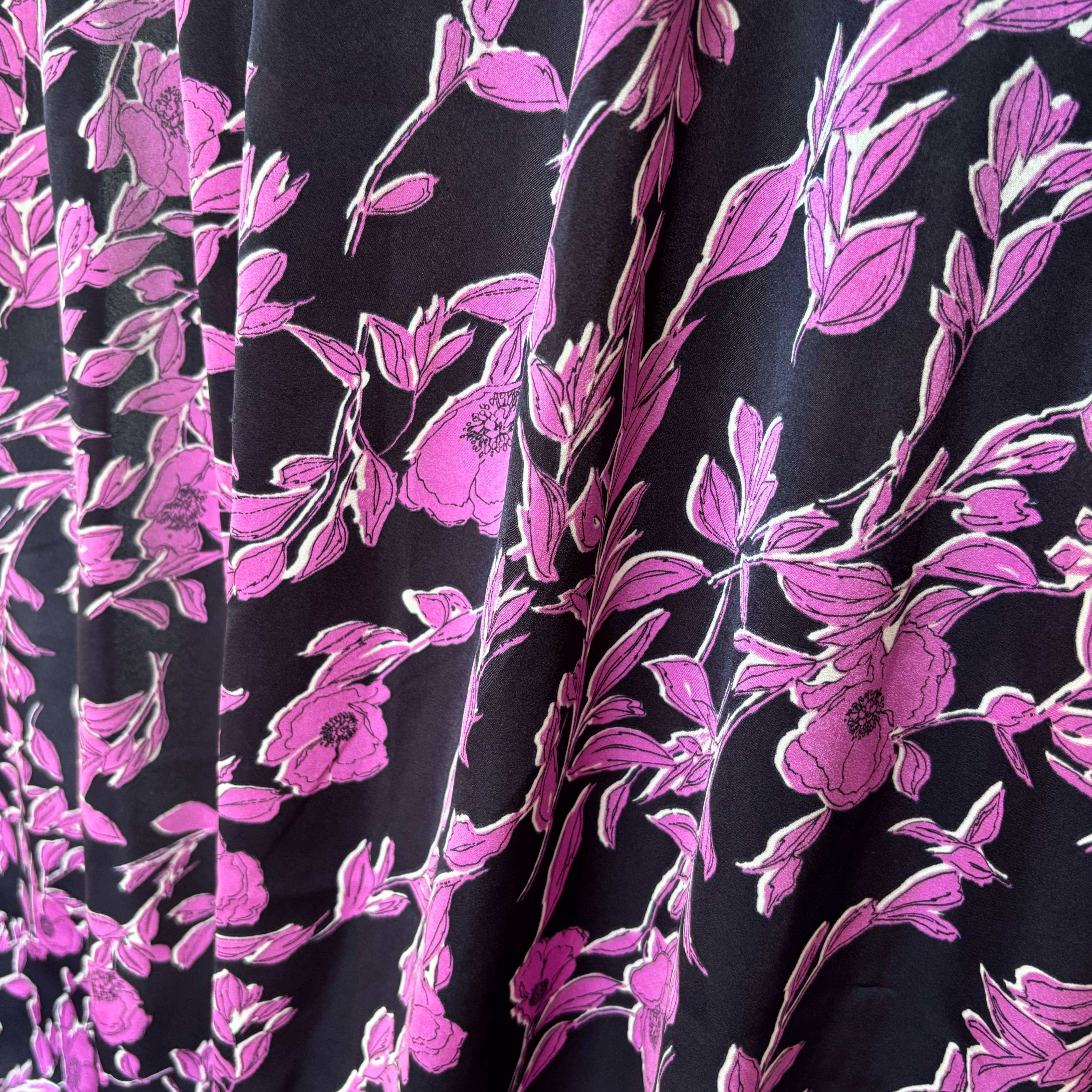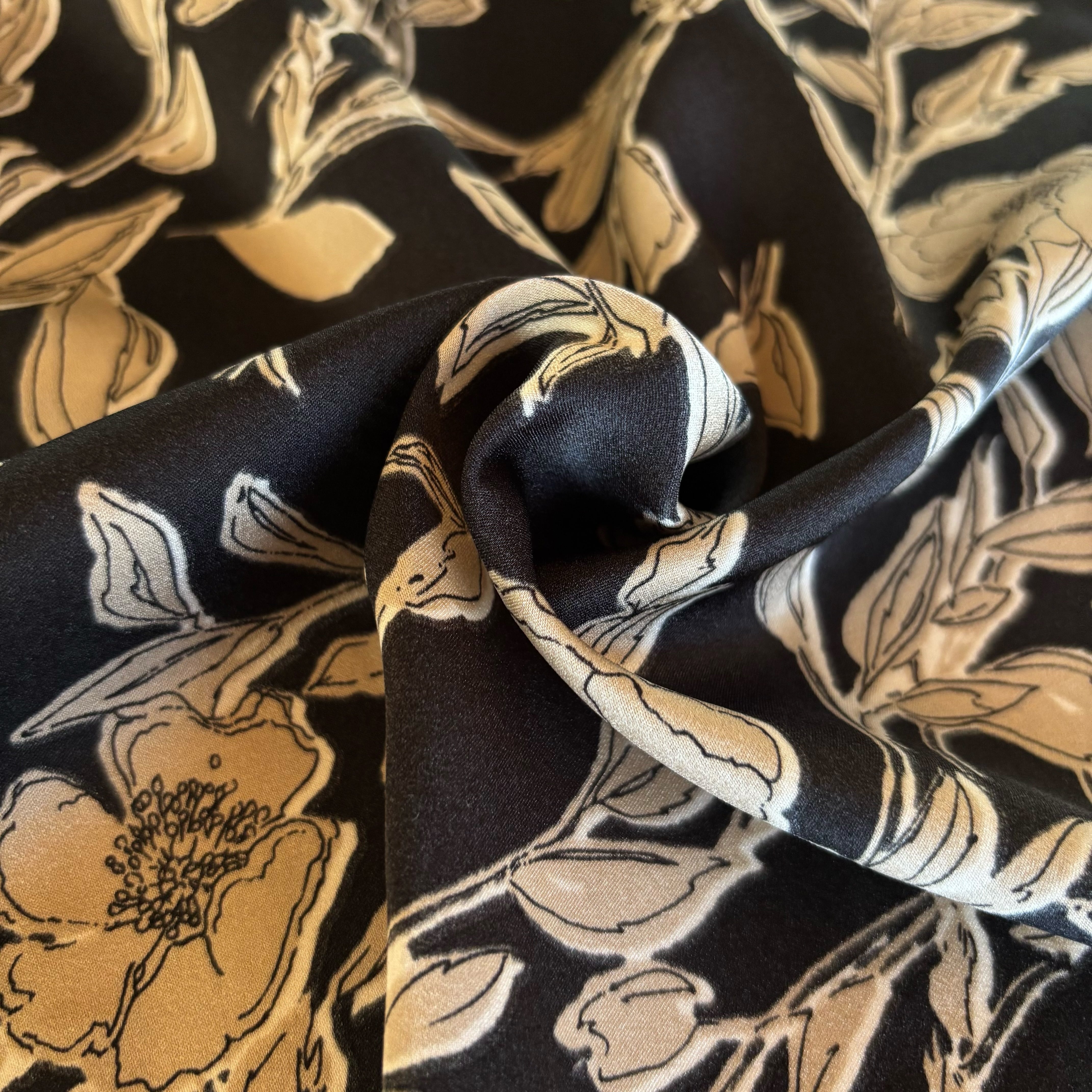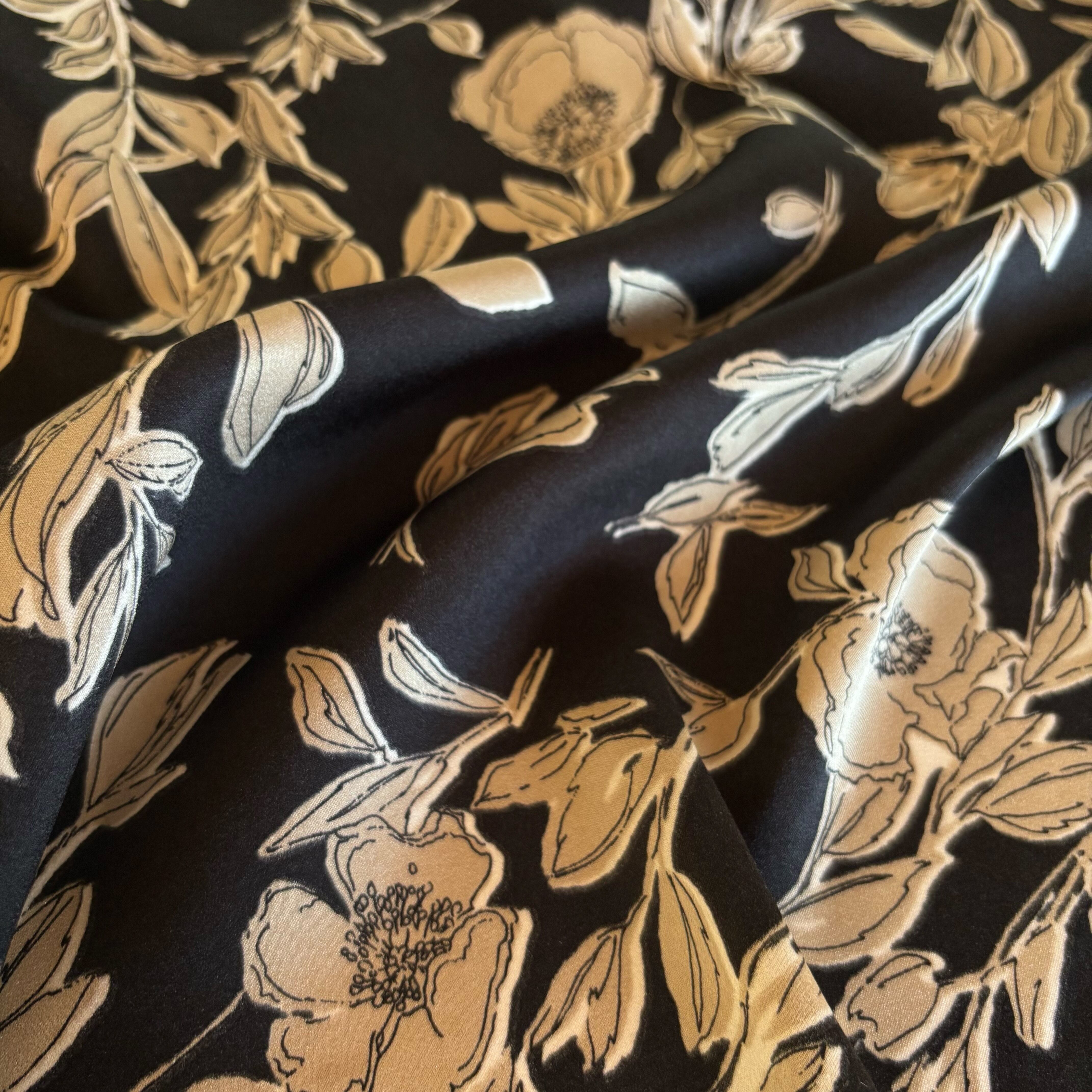 シルクのような高級感のある光沢が魅力の薄手サテン生地です。やわらかく優しいタッチで、肌に心地よく寄り添います。シャツやブラウス、スカートなど幅広い用途に活用できます。