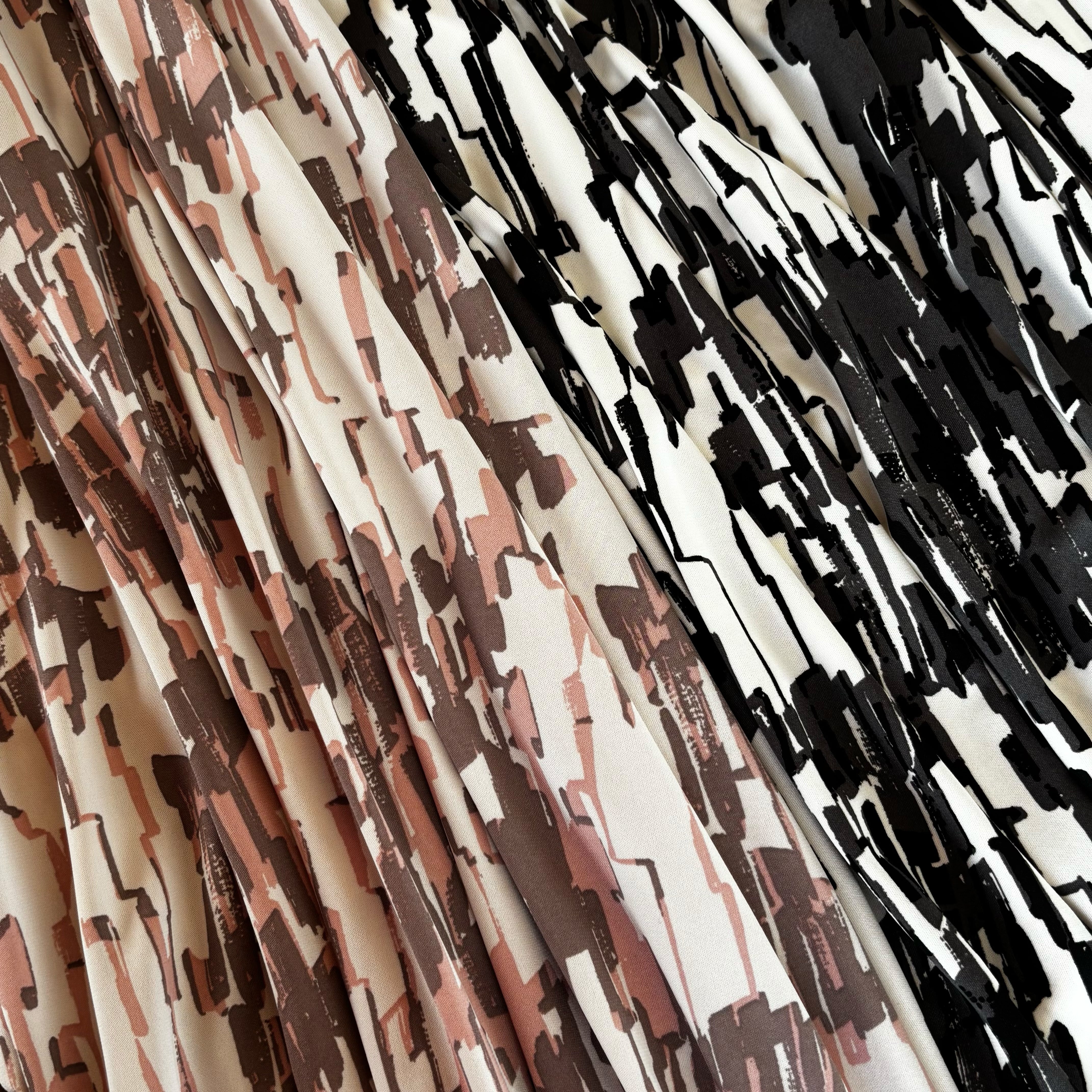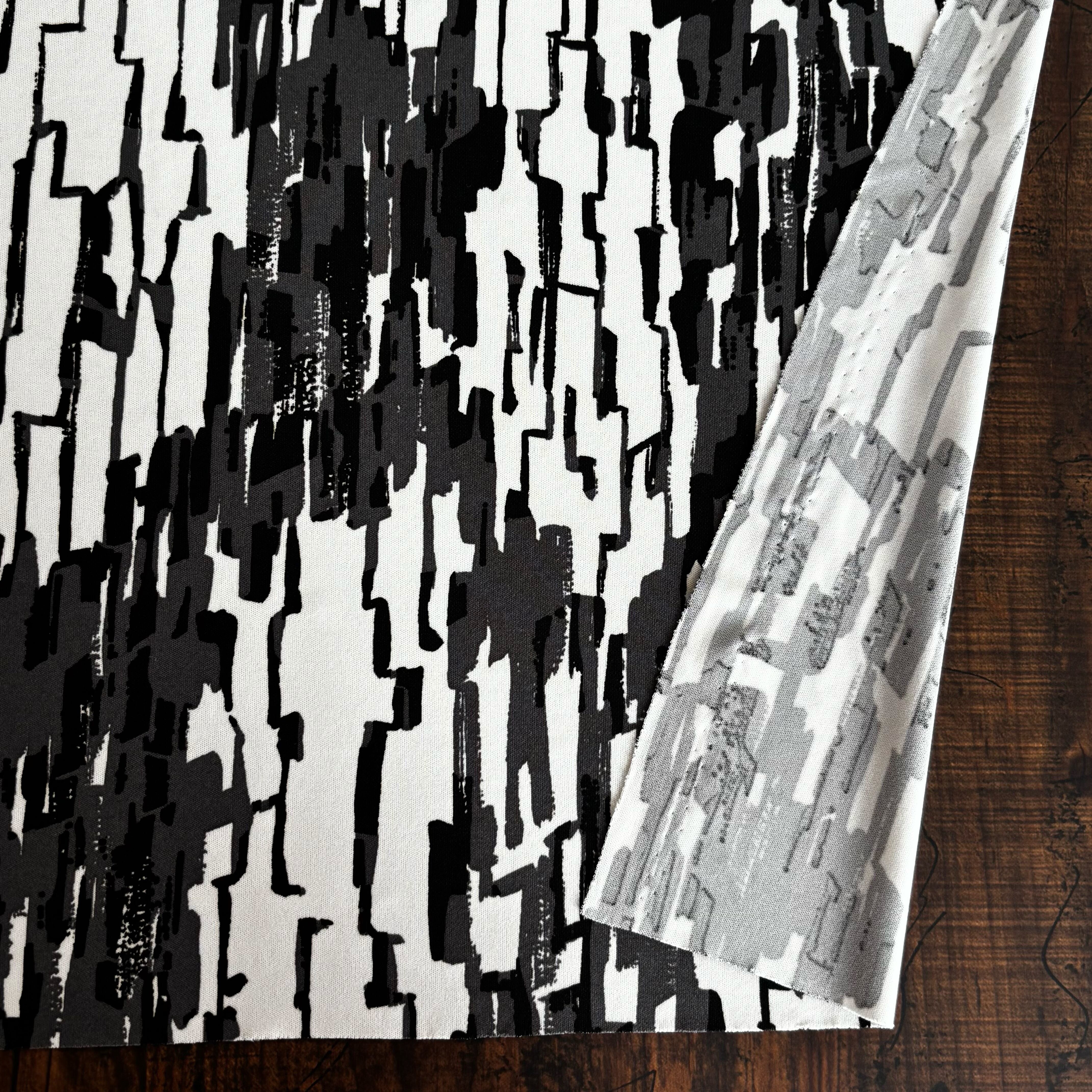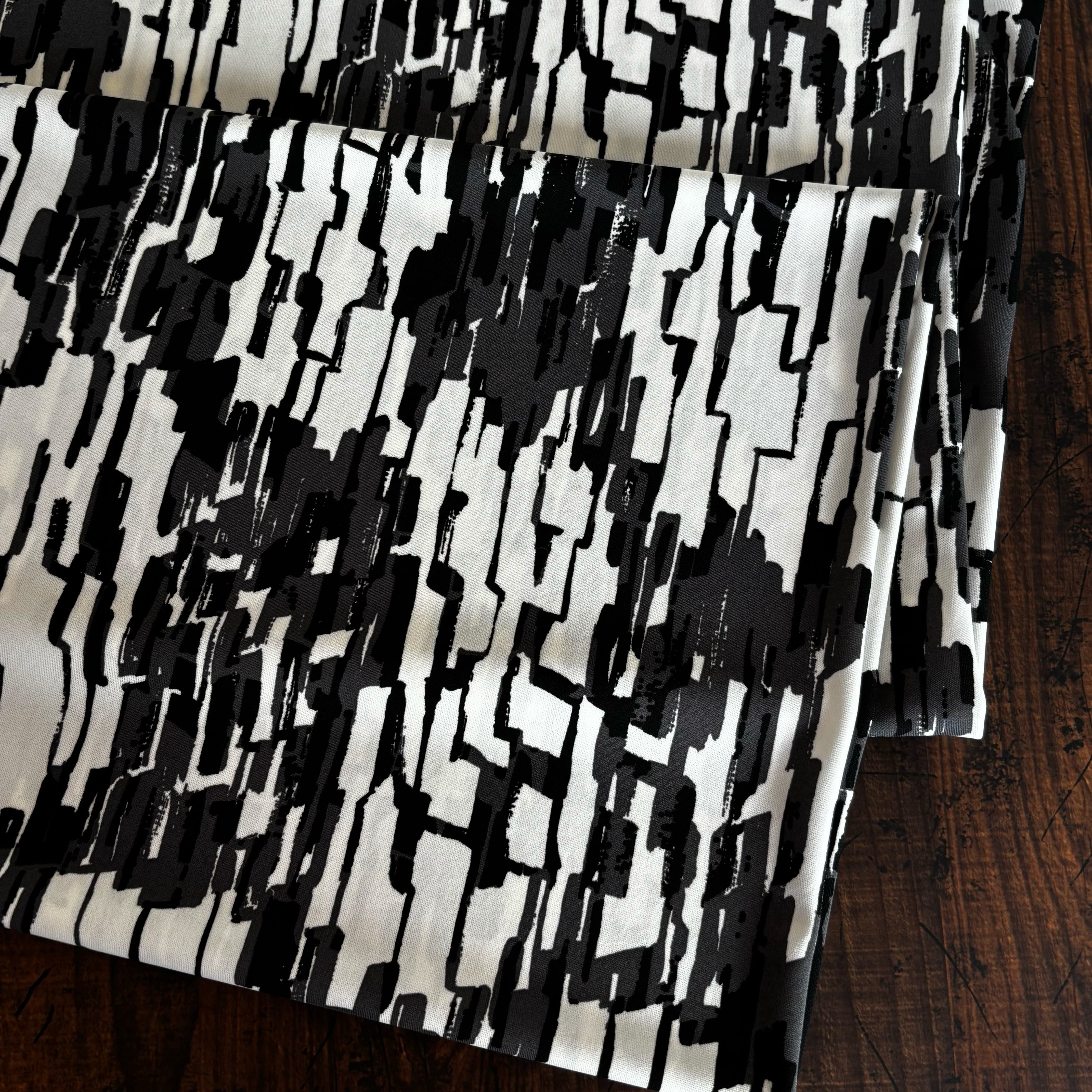 表面が滑らかなスムース生地で、美しいドレープ性が魅力です。さらりとした肌触りに加え、接触冷感を備えているため、オールシーズンで快適にお使いいただけます。適度な伸縮性と程よい厚みがあり、Tシャツやワンピース、カーディガンなど、幅広い用途に活用できます。