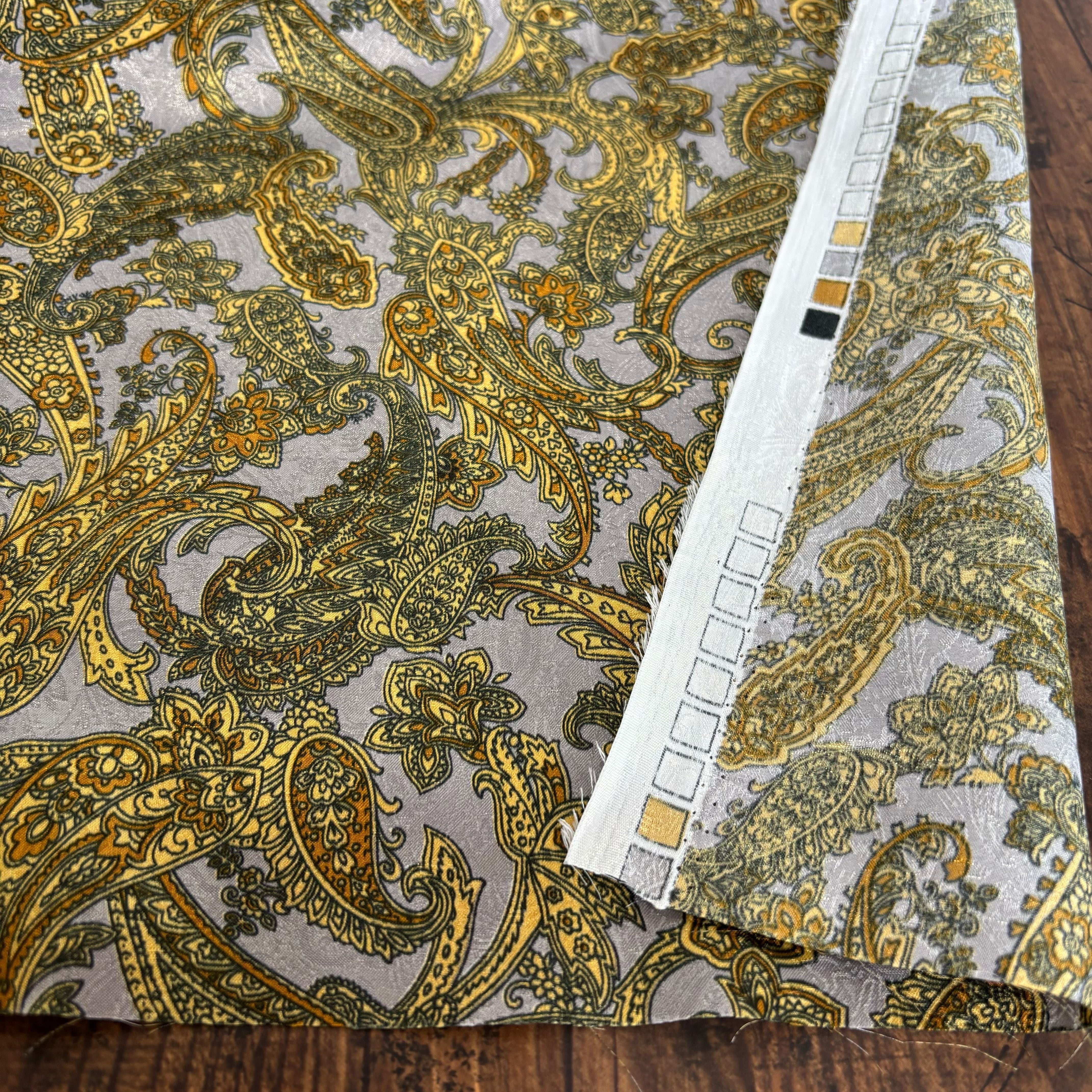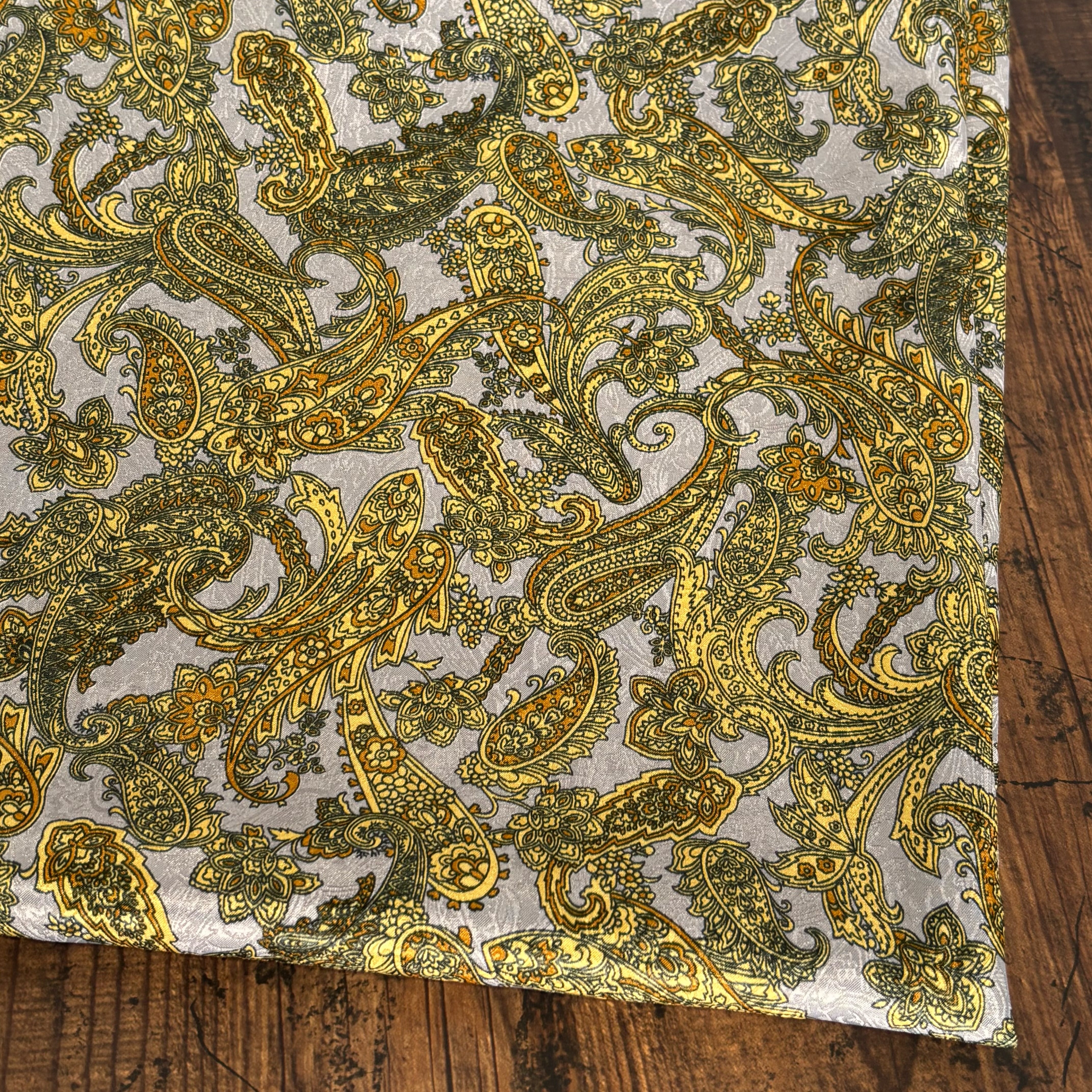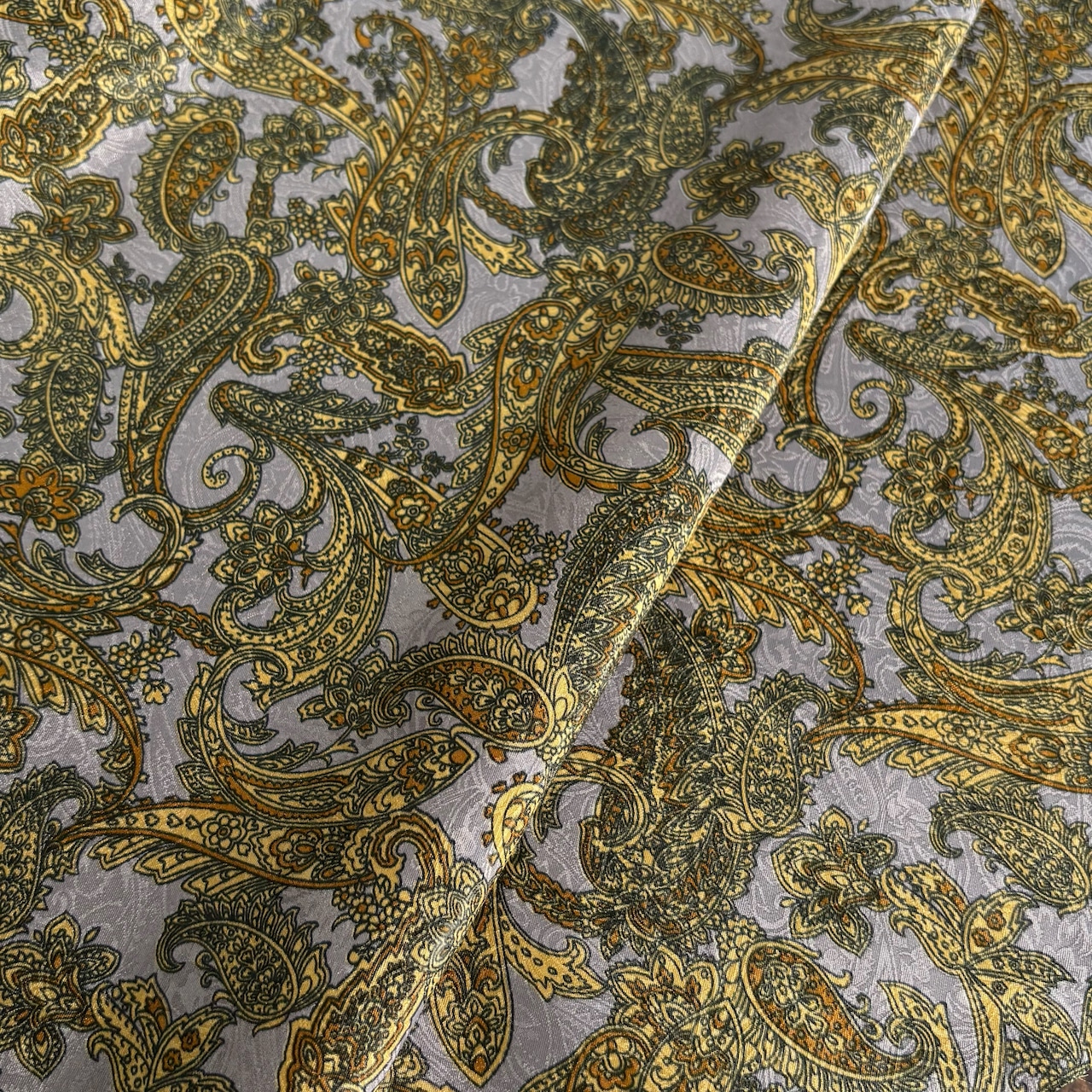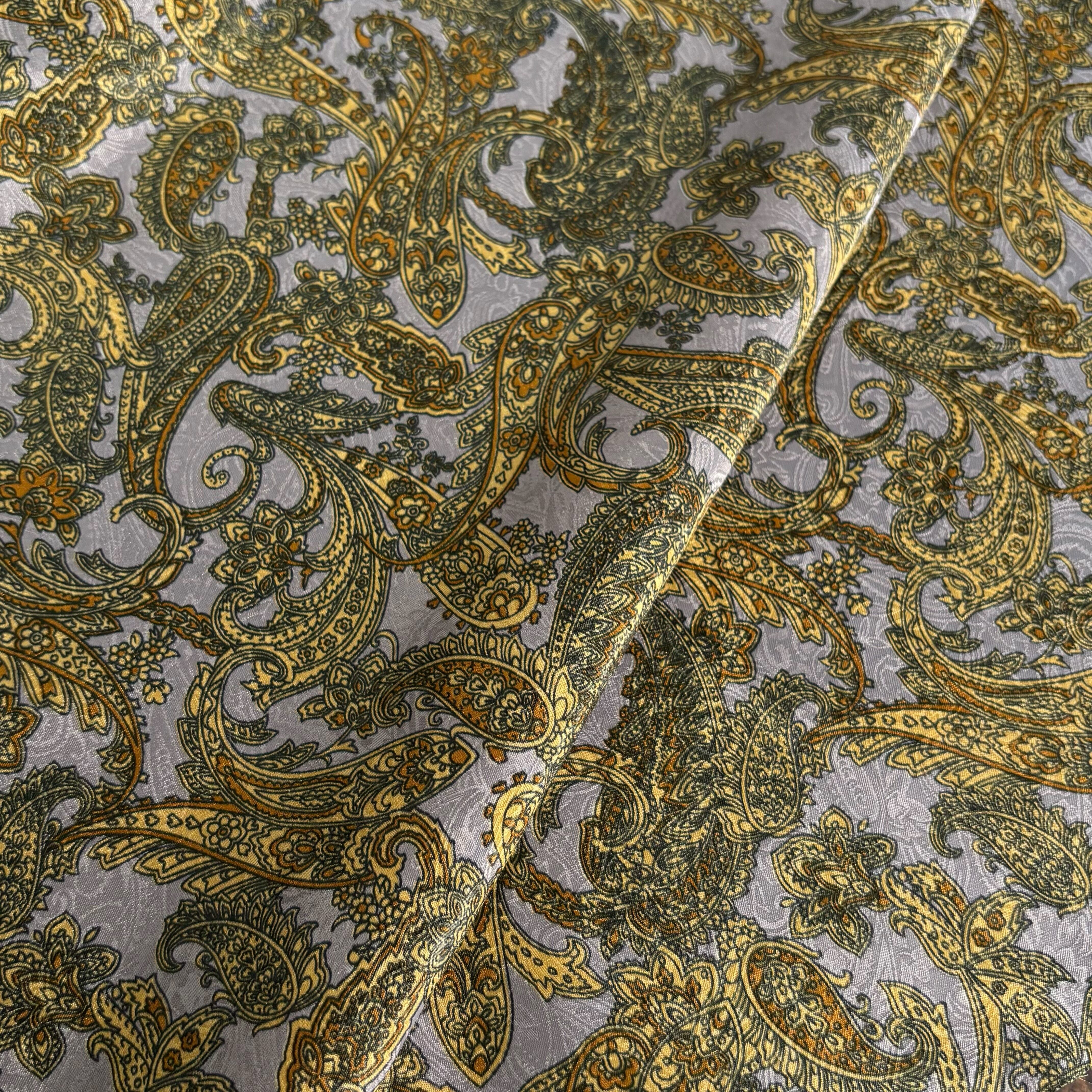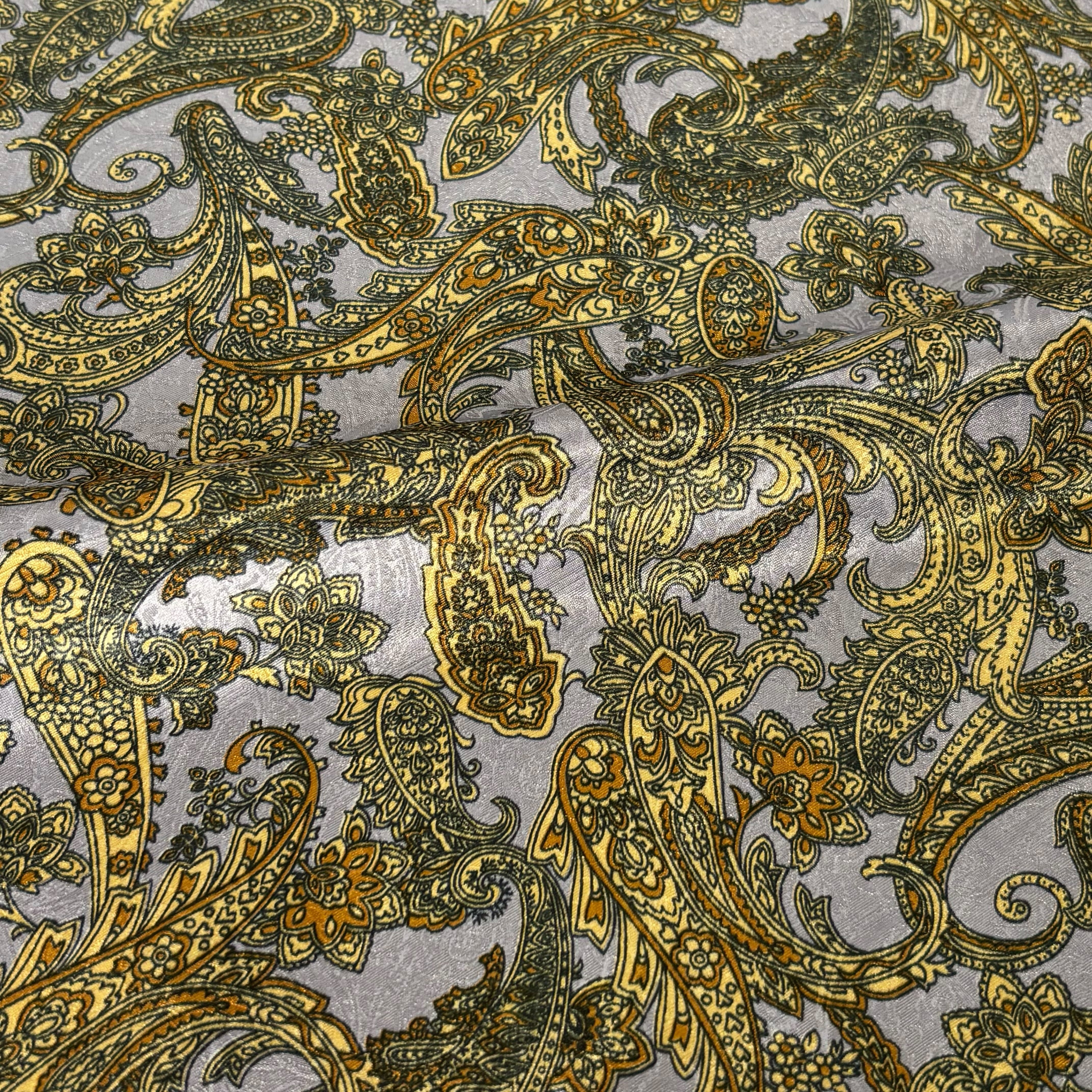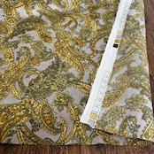 繊細な質感と上品な光沢感が魅力の生地です。大小さまざまな模様が重なり合うことで、奥行きのある立体的なデザインに仕上がっています。華やかで高級感があり、ドレスなどの特別な装いにもおすすめです。