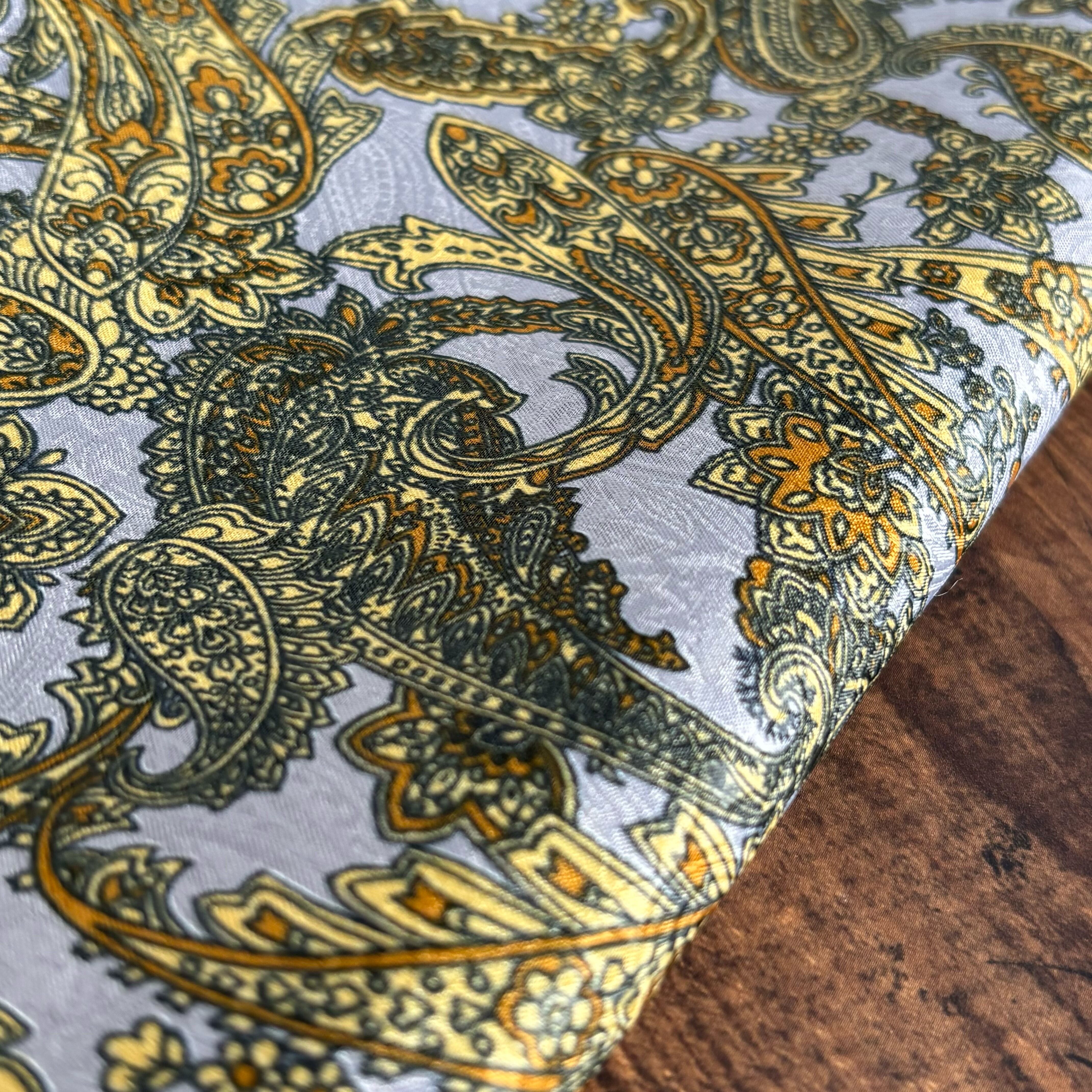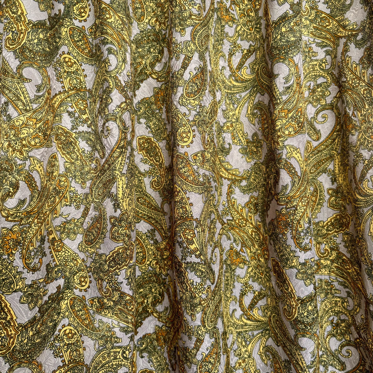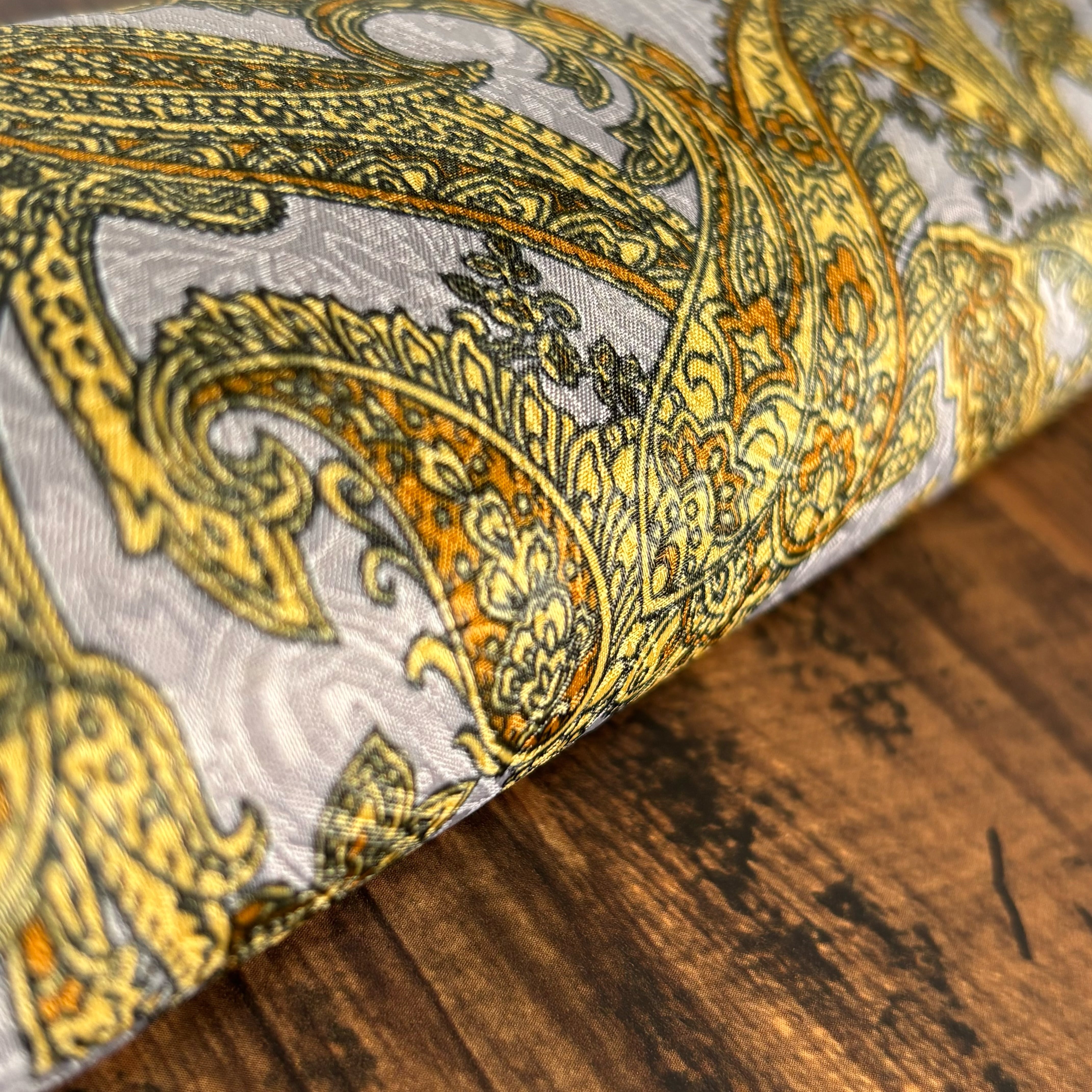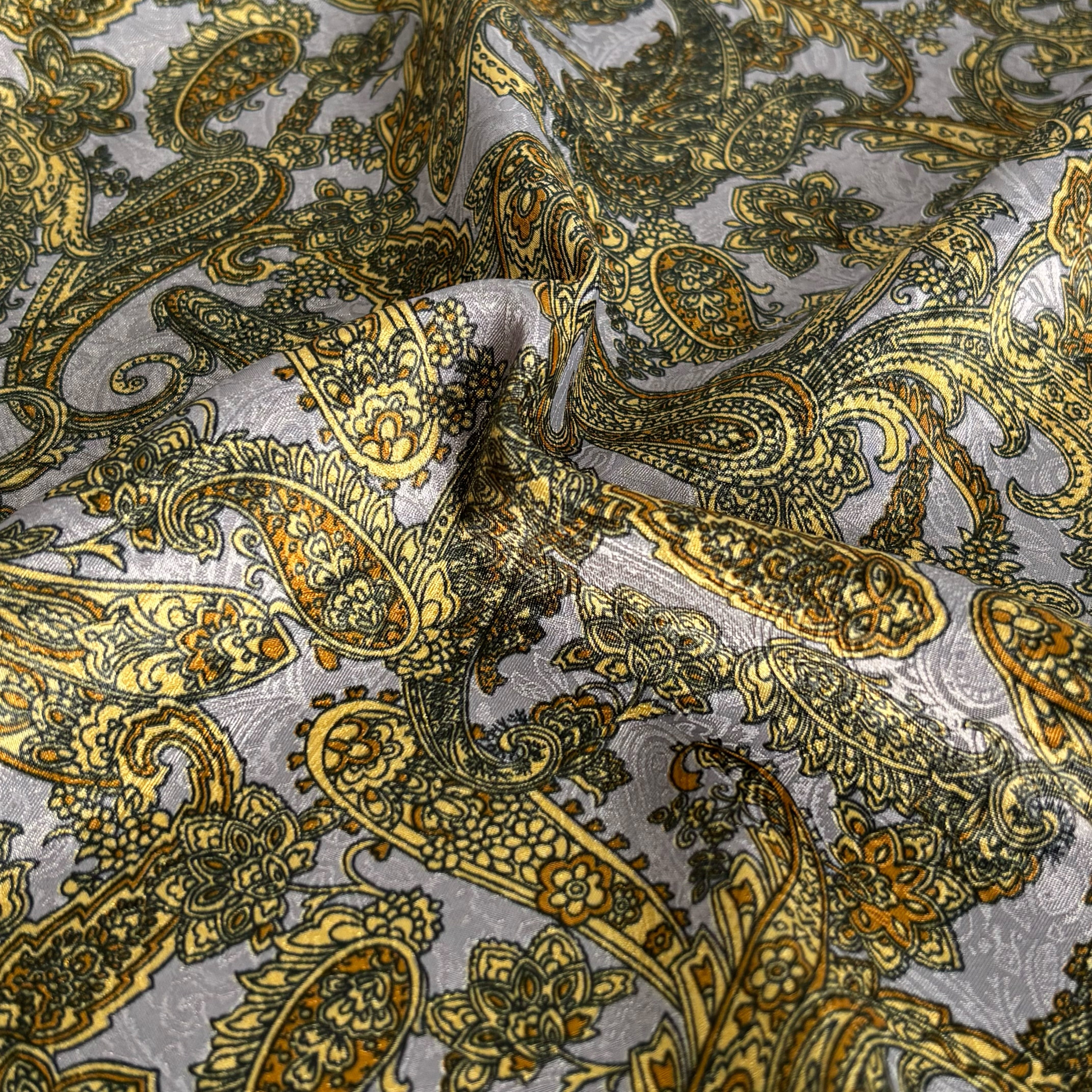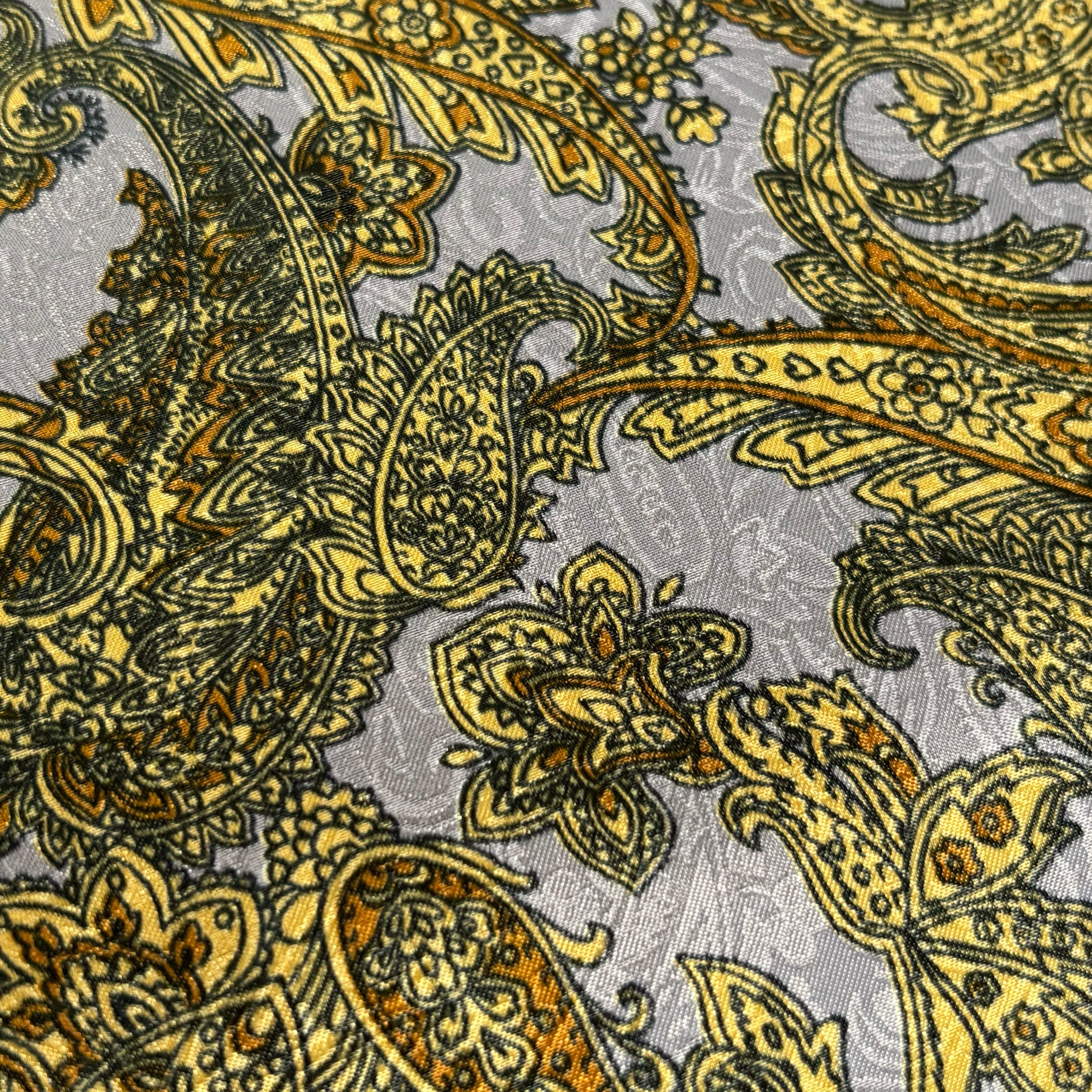 繊細な質感と上品な光沢感が魅力の生地です。大小さまざまな模様が重なり合うことで、奥行きのある立体的なデザインに仕上がっています。華やかで高級感があり、ドレスなどの特別な装いにもおすすめです。