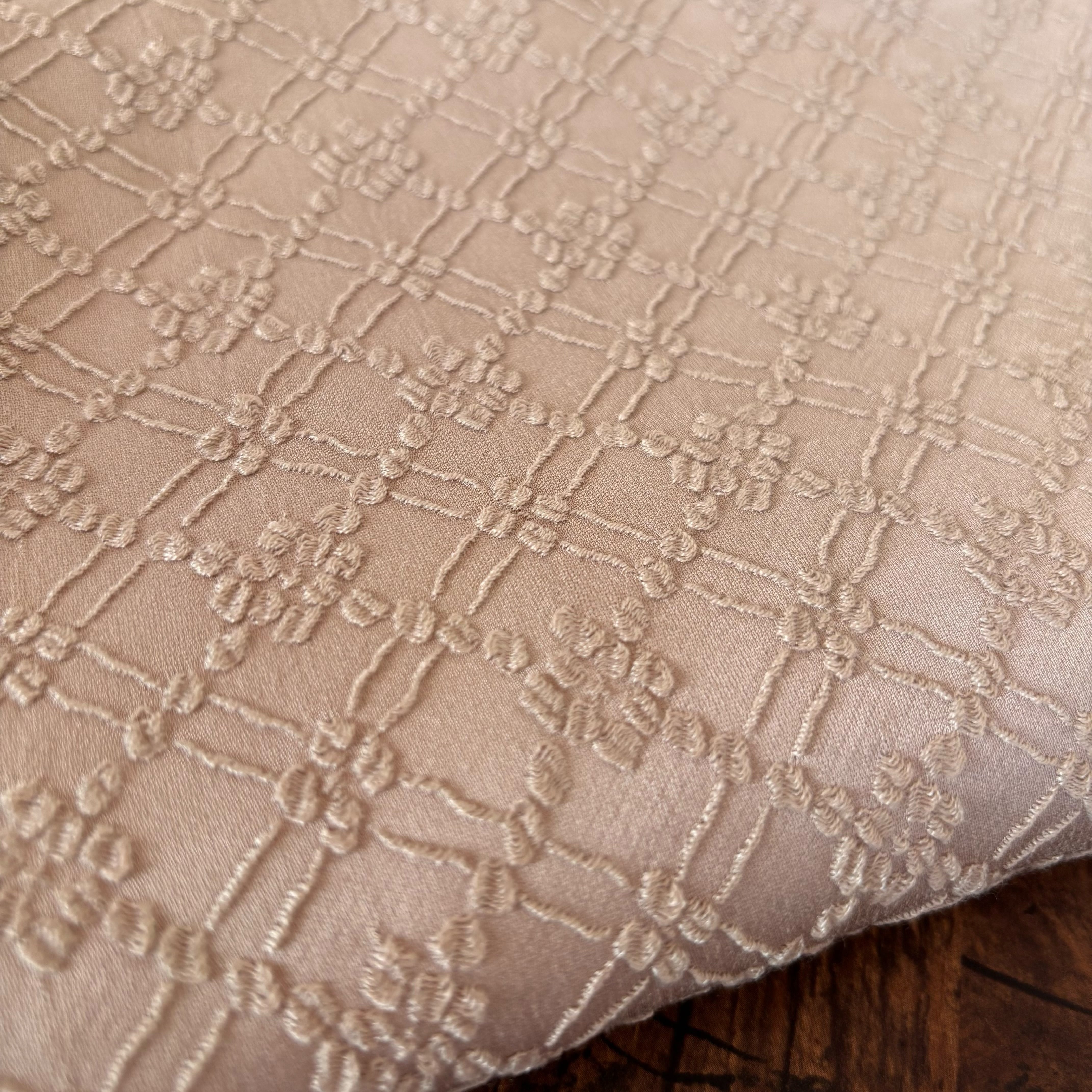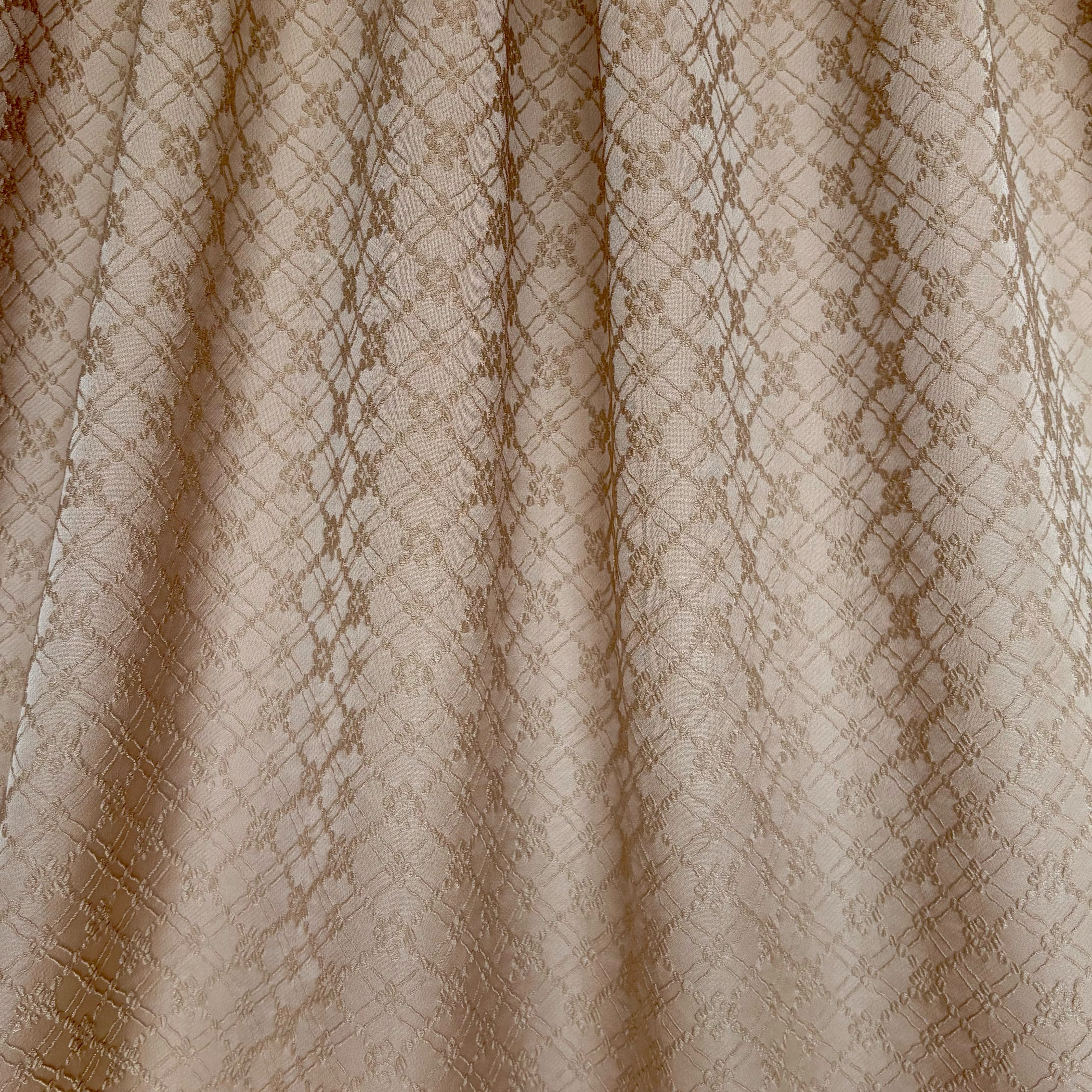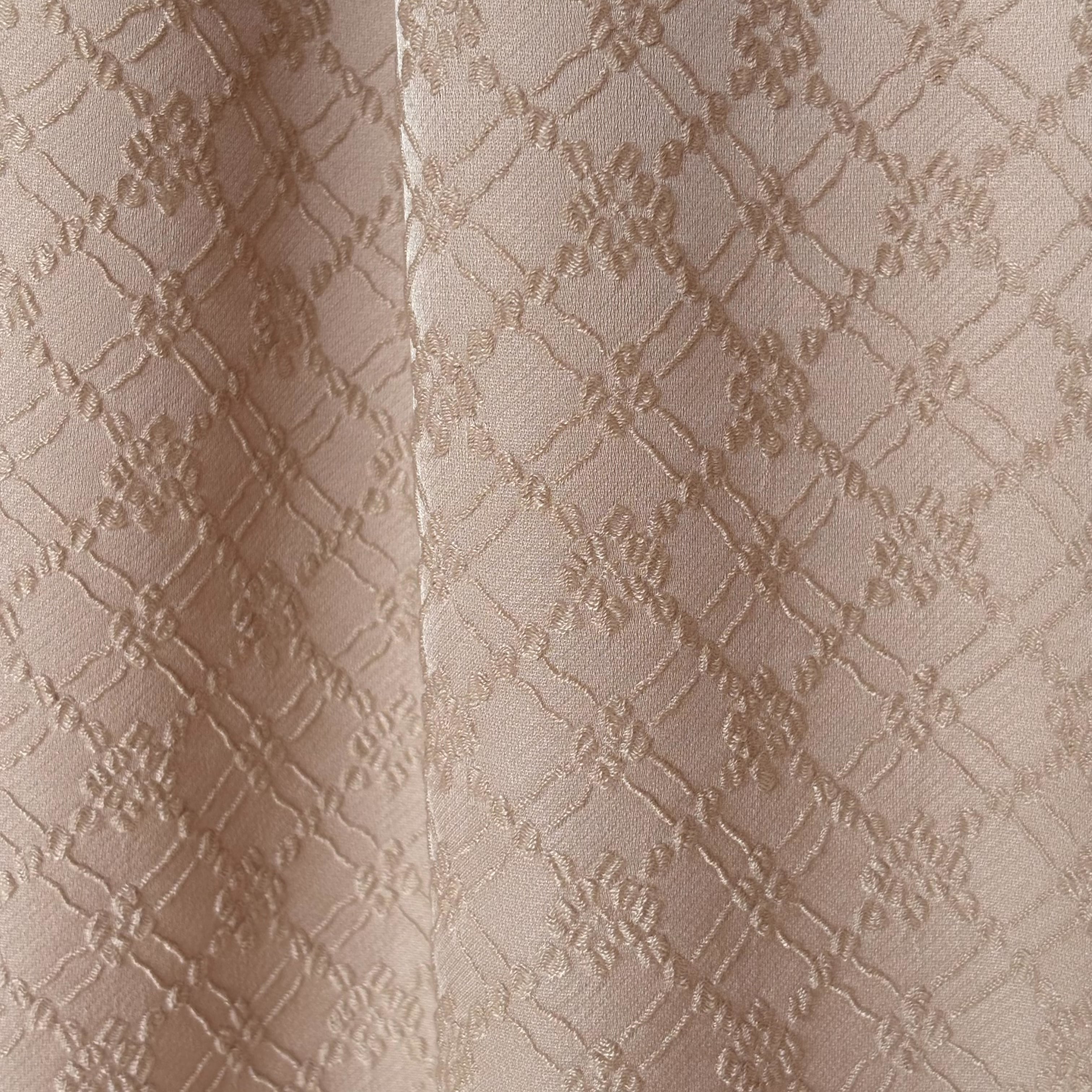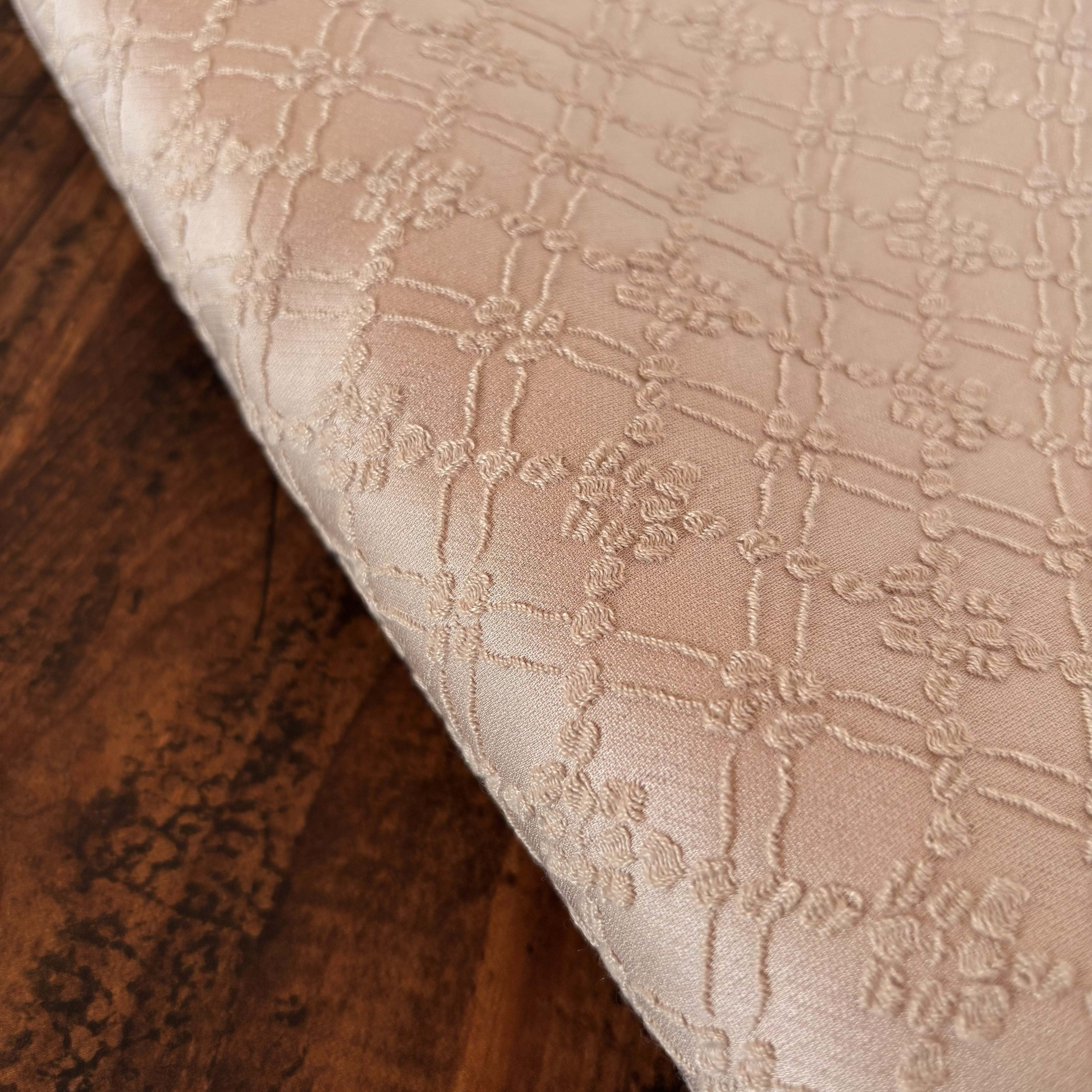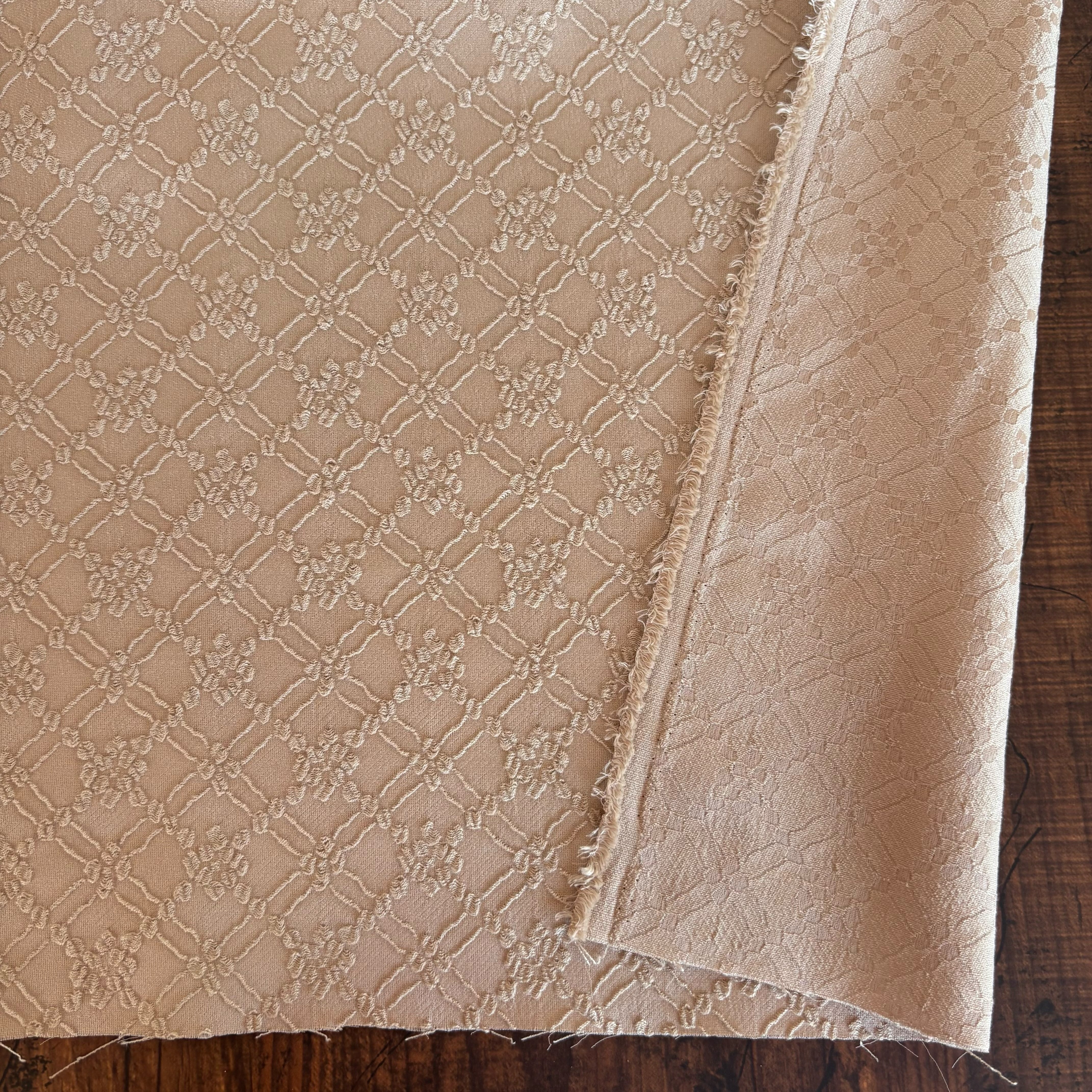 刺繍を施したような繊細な表情が魅力のジャガード生地です。凹凸のある立体的な織り構造ながらしなやかで軽く、扱いやすいのが特徴です。しっとりとした上質な光沢感があり、落ち着いたベージュカラーでフォーマルなシーンにも取り入れやすい生地です。ジャケットやワンピースなど、幅広い用途に活用できます。
