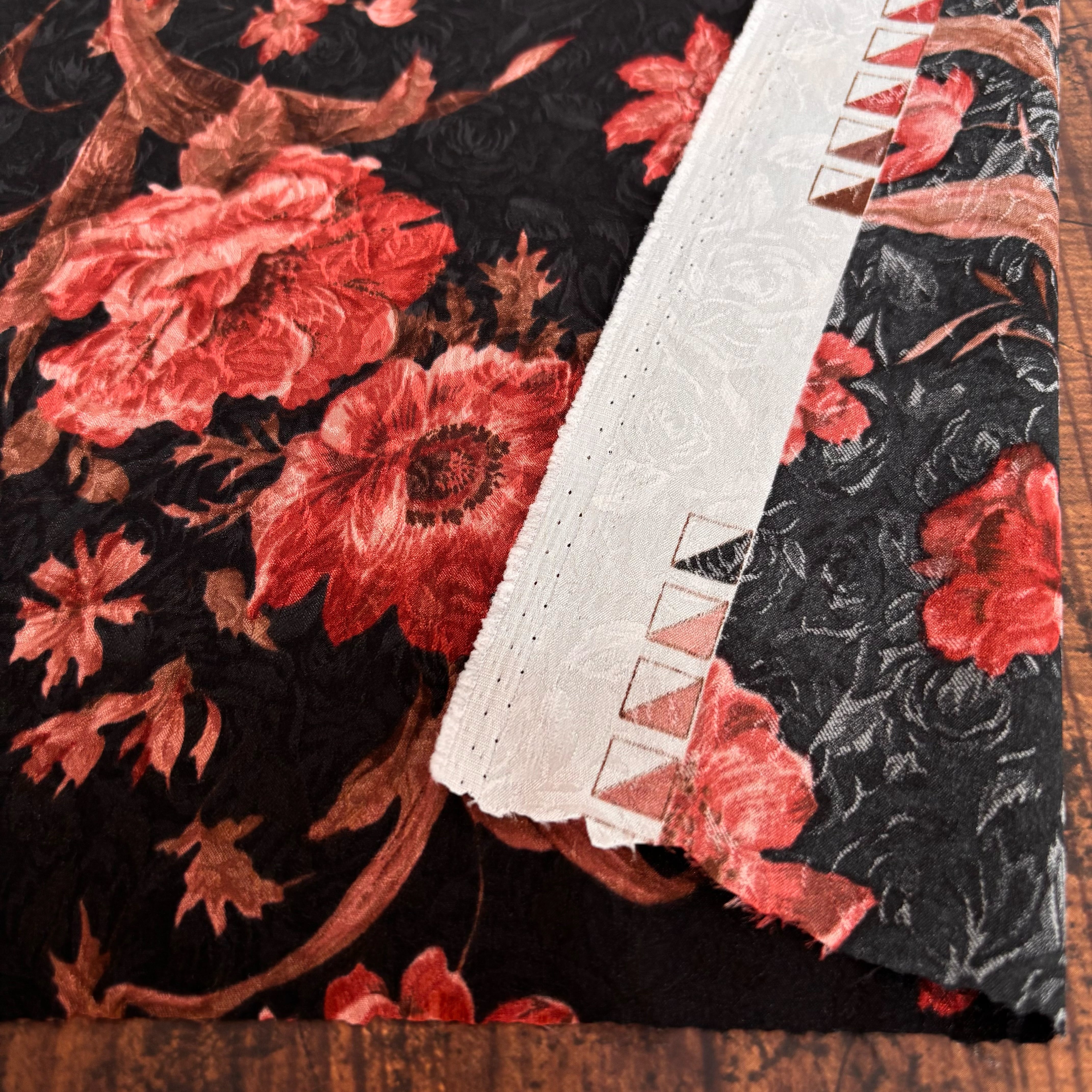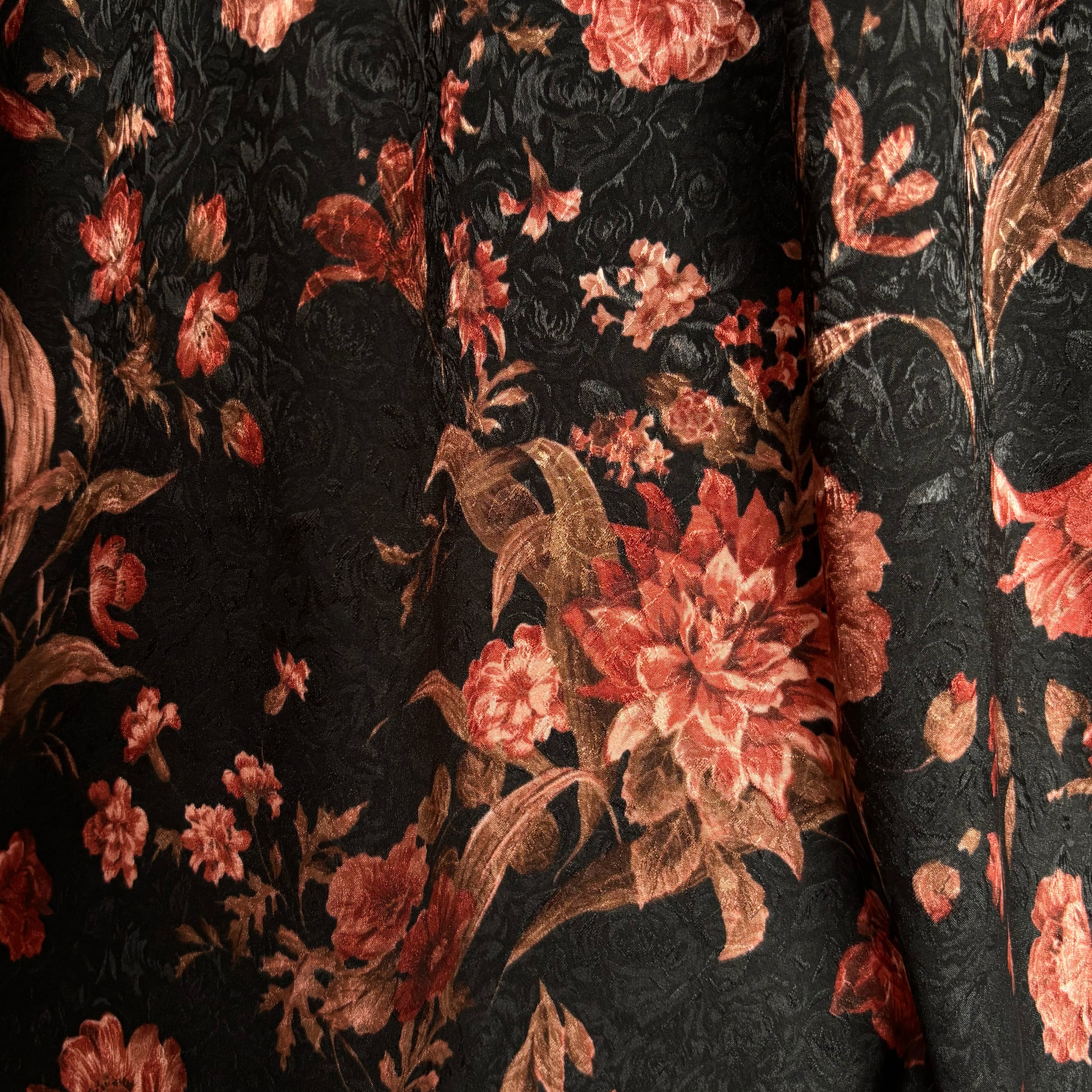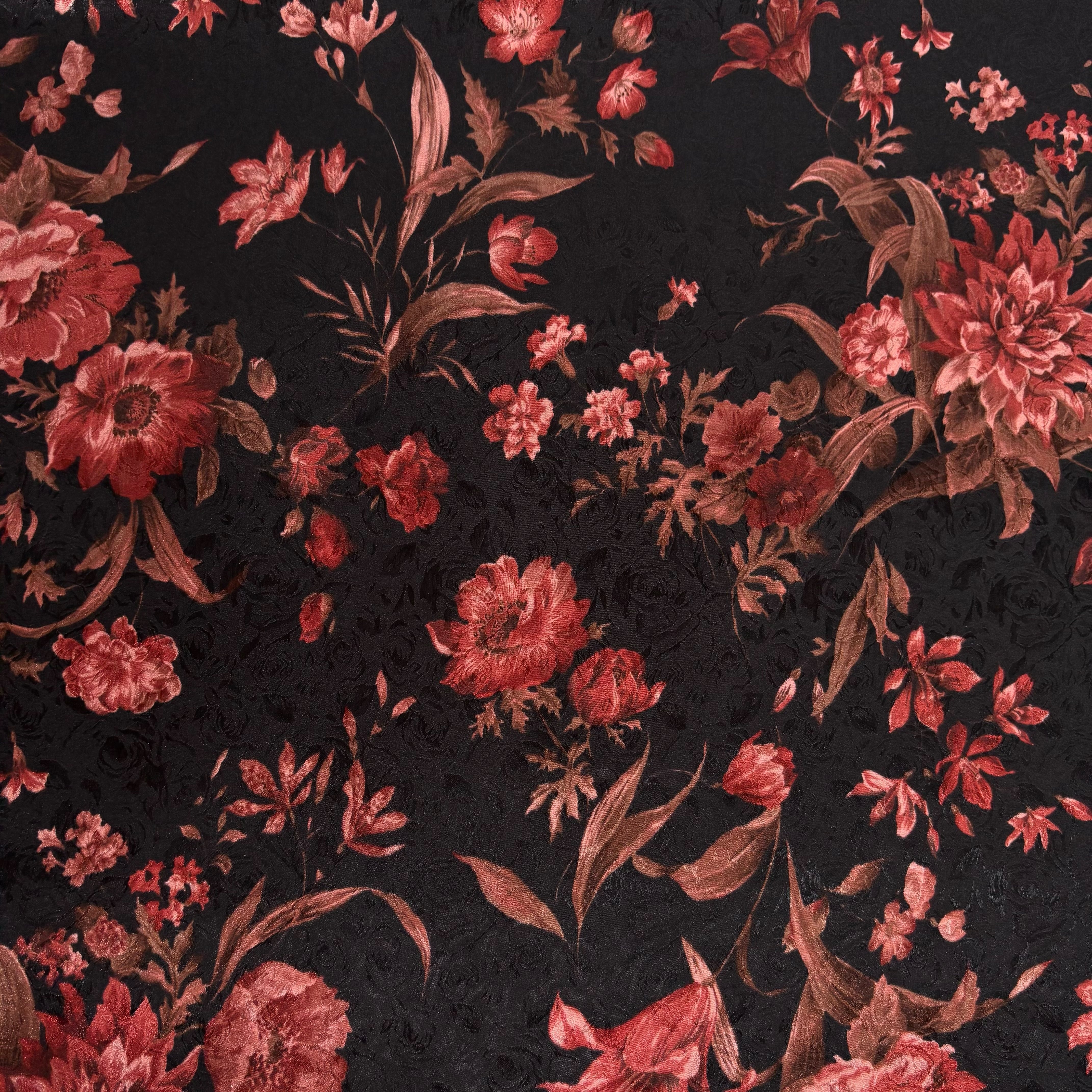柔らかく戻りの良いしなやかなストレッチ性を備えたストレッチサテンジャガードです。柄と柄が重なり合うことで、奥行きのある立体的なデザインに仕上がっています。薄手でしなやかなドレープ性があり、ブラウスやワンピース、スカートなど幅広い用途に活用できます。