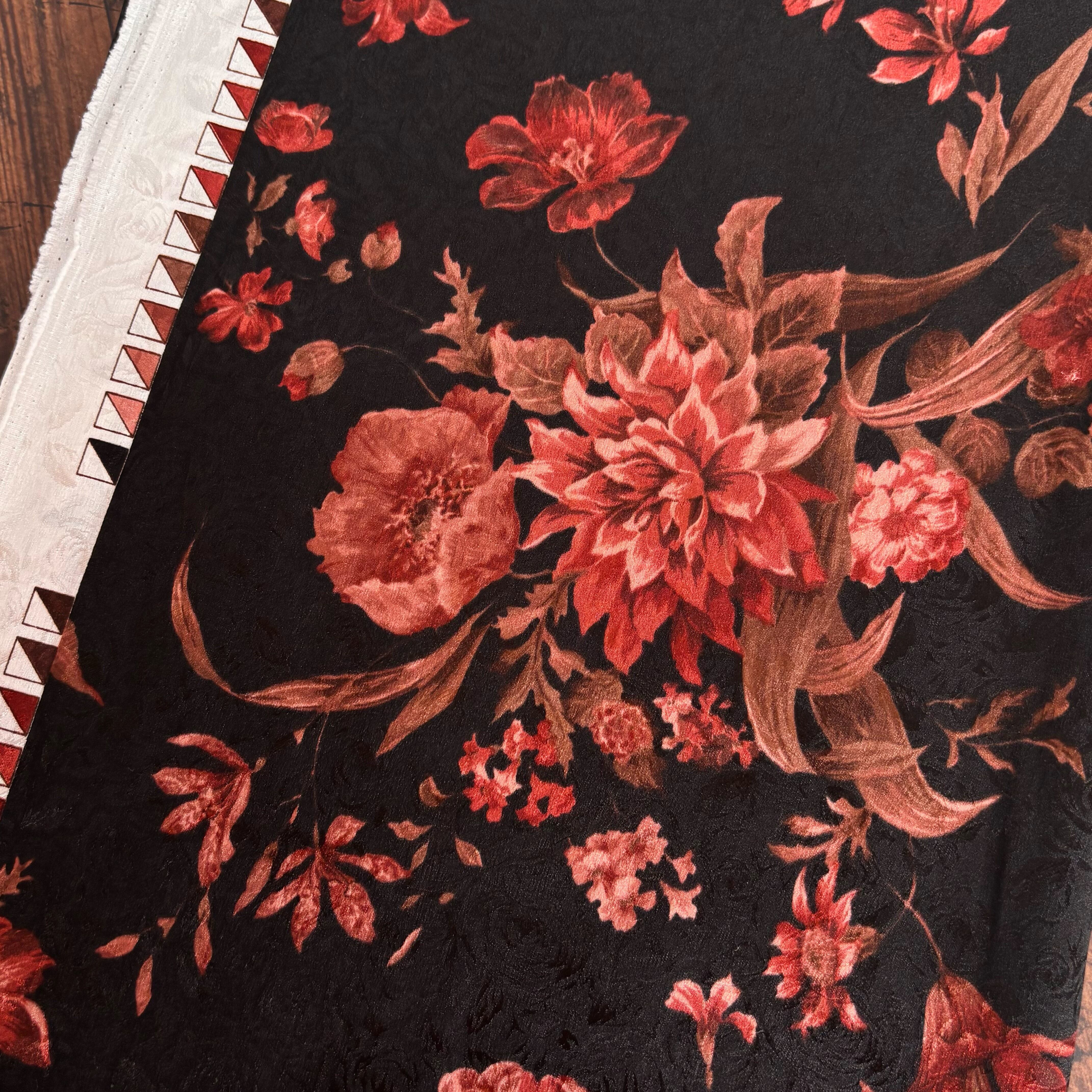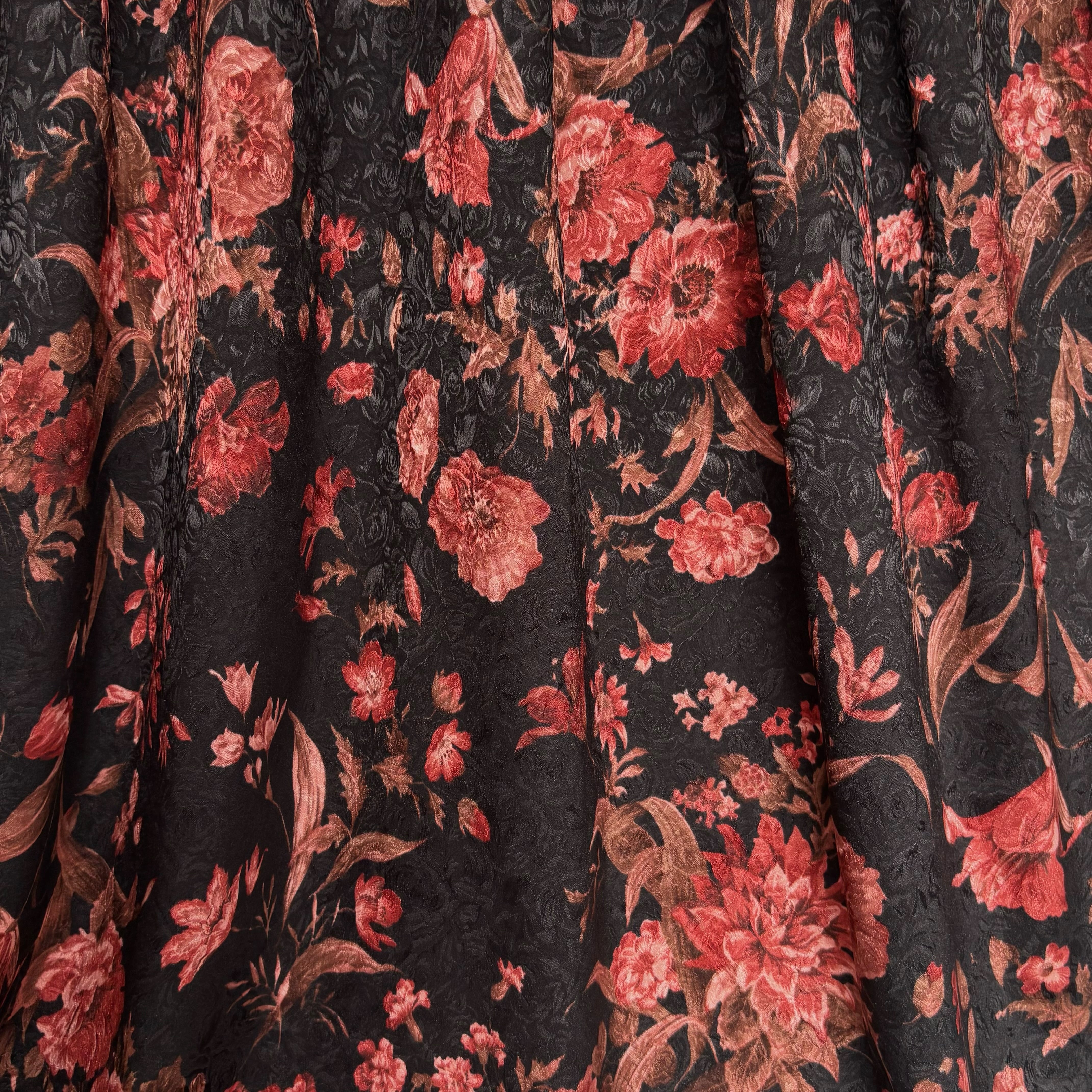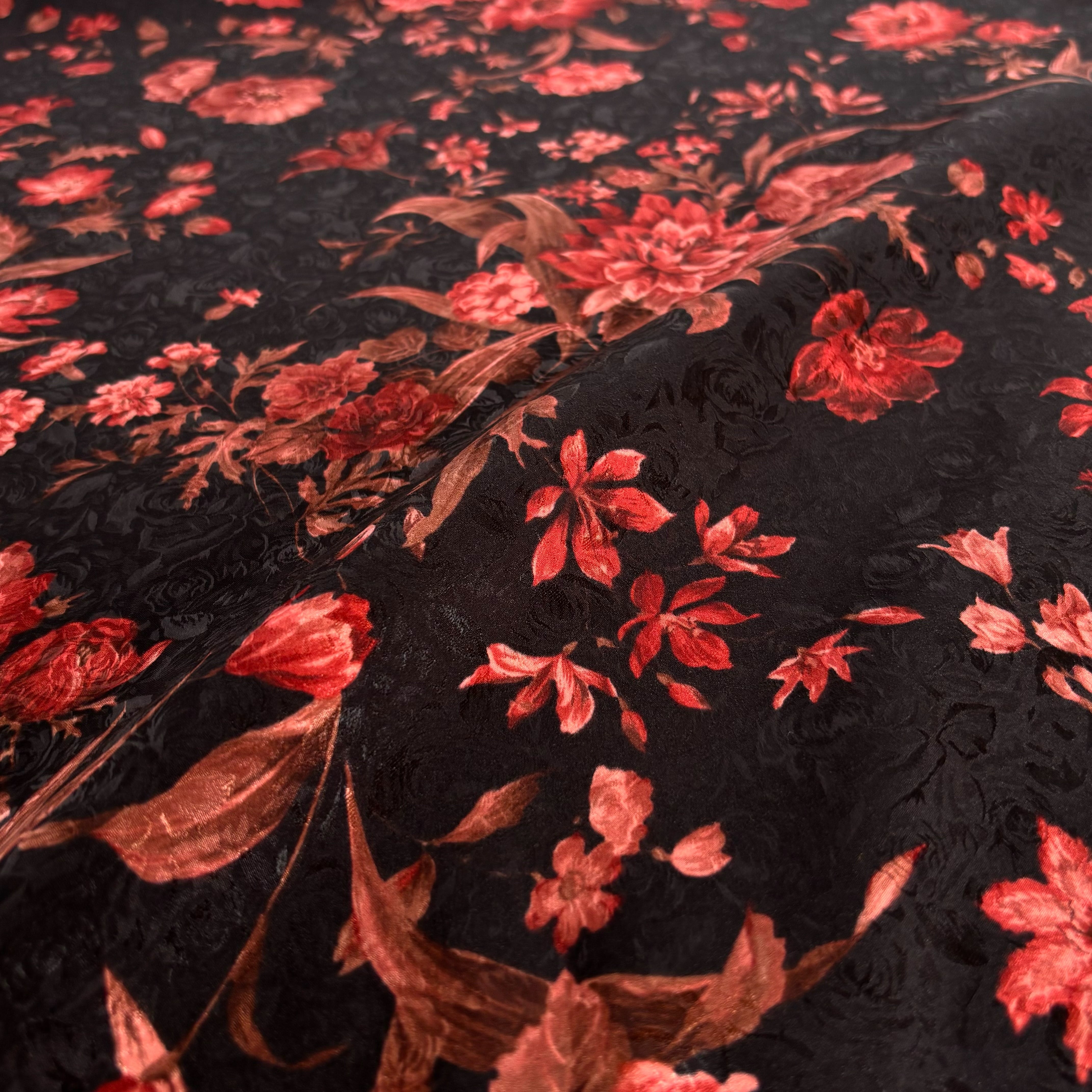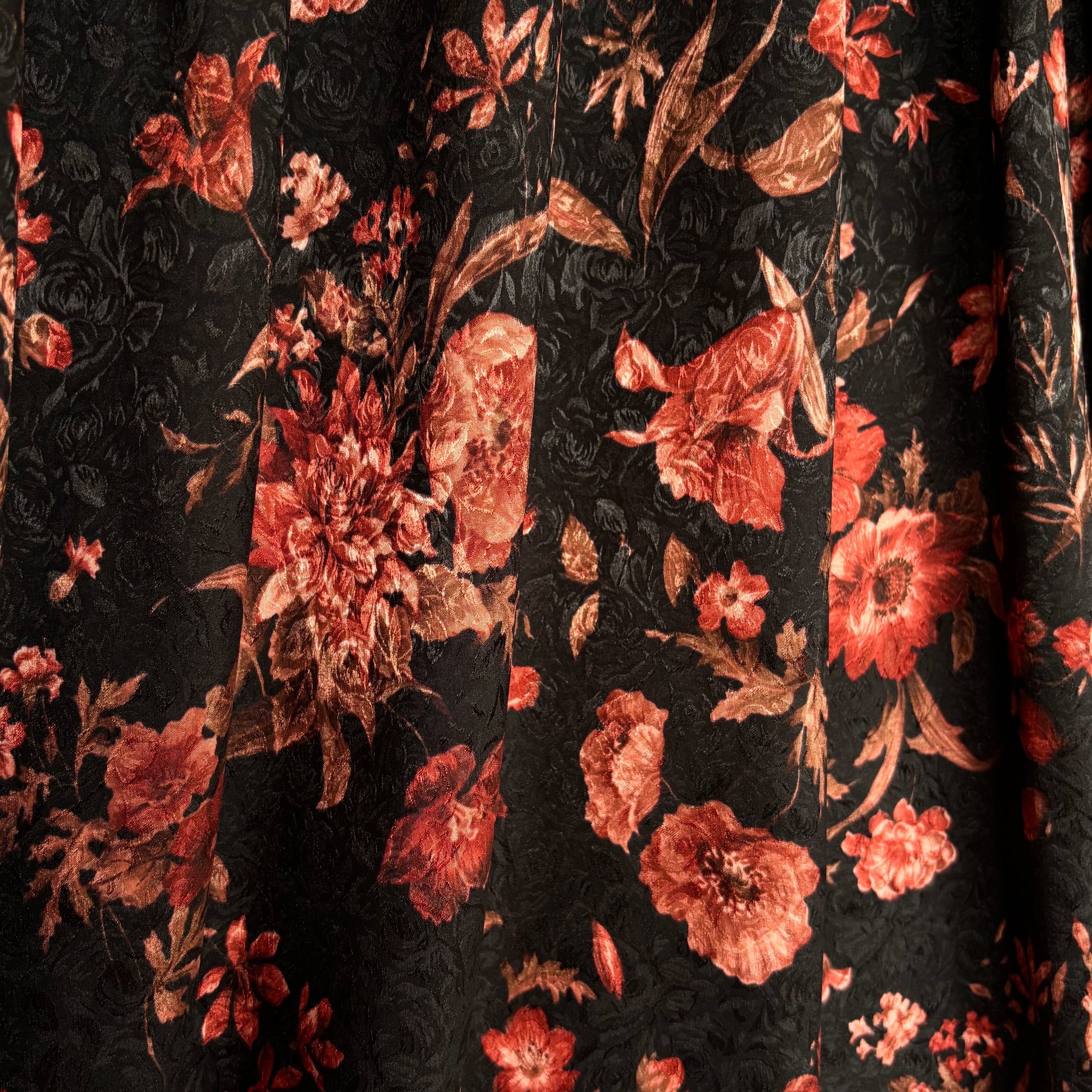 柔らかく戻りの良いしなやかなストレッチ性を備えたストレッチサテンジャガードです。柄と柄が重なり合うことで、奥行きのある立体的なデザインに仕上がっています。薄手でしなやかなドレープ性があり、ブラウスやワンピース、スカートなど幅広い用途に活用できます。