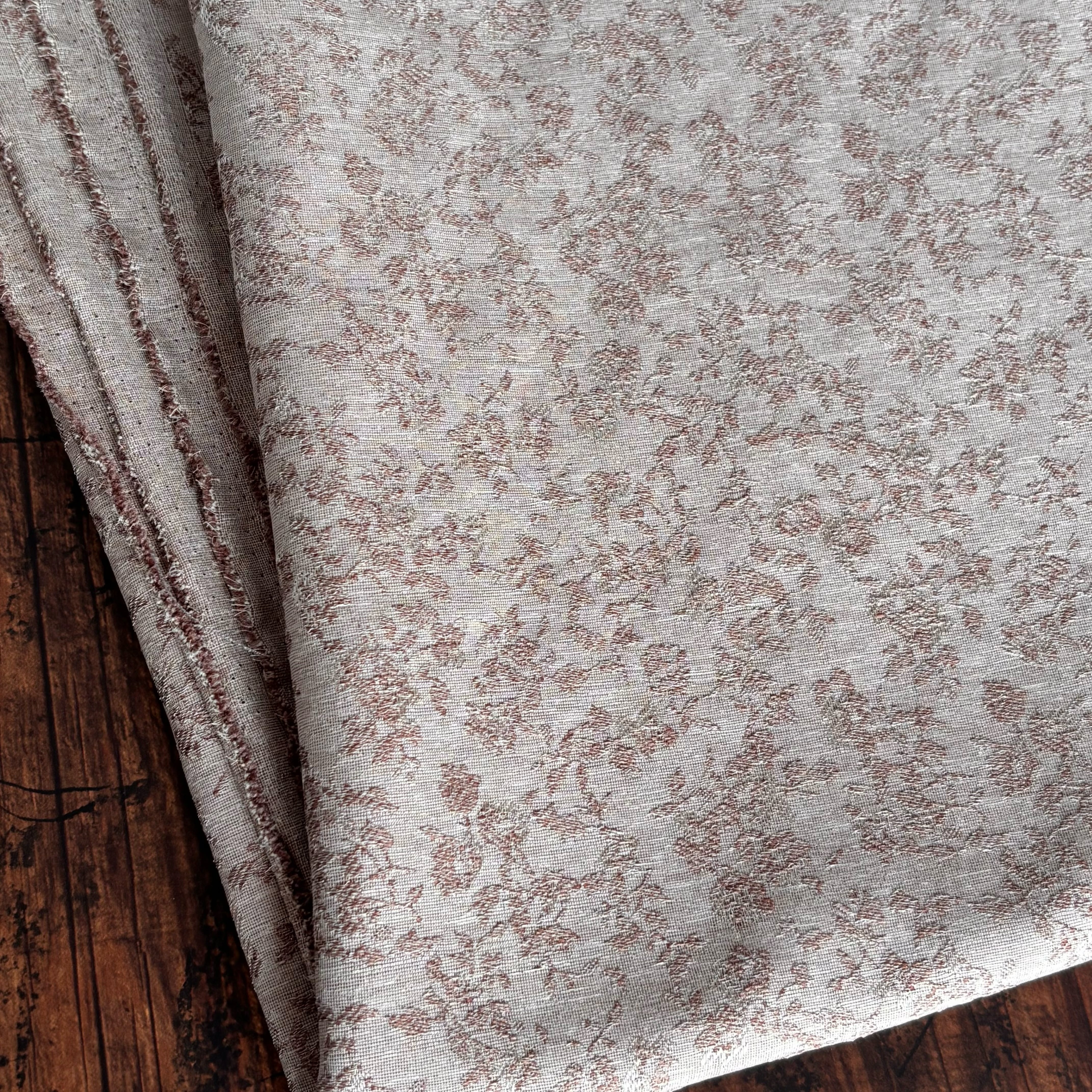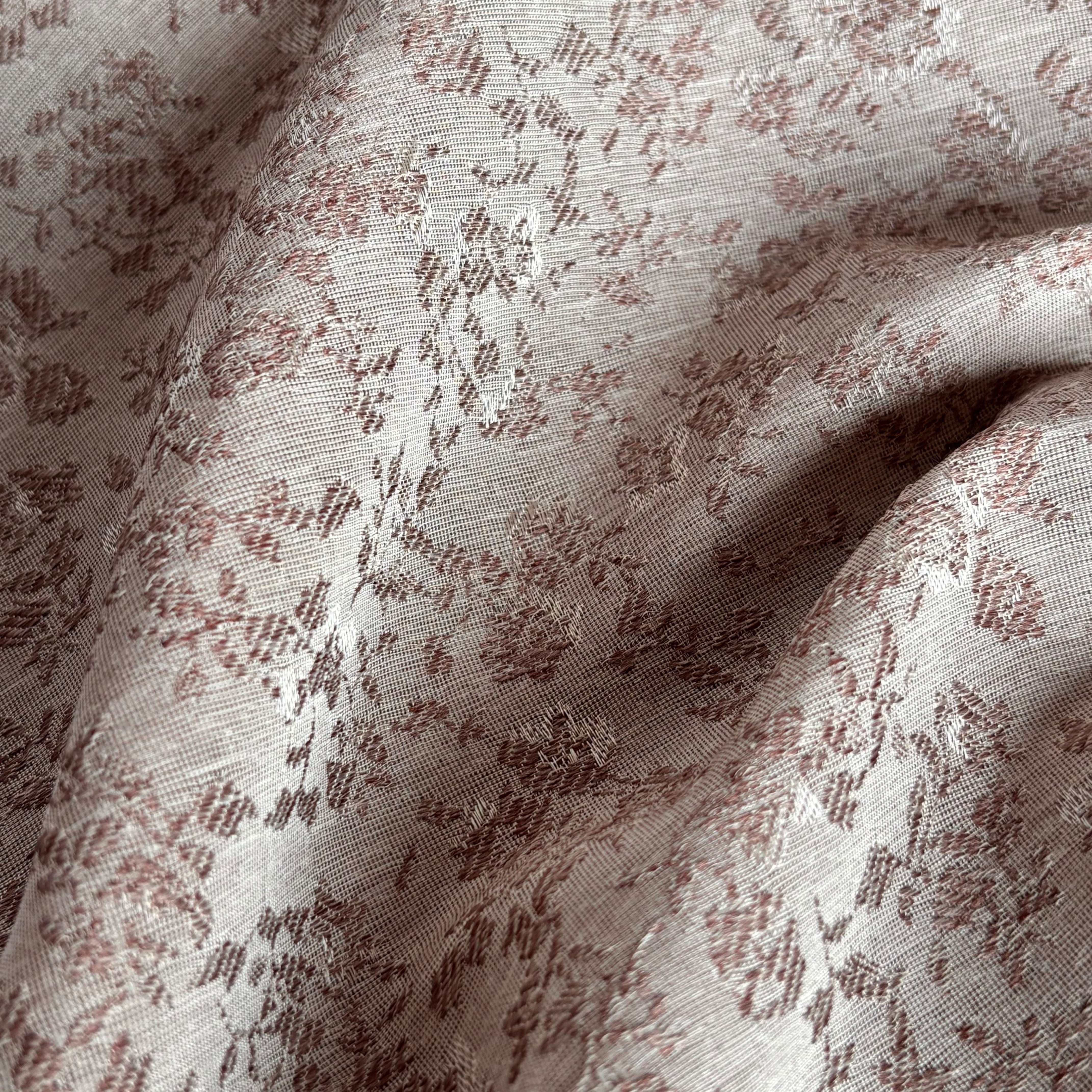 リネンのようなナチュラルな風合いを表現した、ポリエステル100%のジャガード生地です。薄手で軽やかさがありながら、シワになりにくく扱いやすいイージーケア素材です。繊細な小花柄を立体感のある織りで表現しており、表情豊かでやさしい印象が魅力です。接触冷感性と速乾性も兼ね備えており、さらりと快適にお使いいただけます。